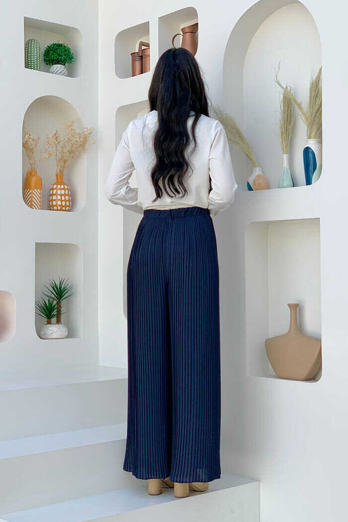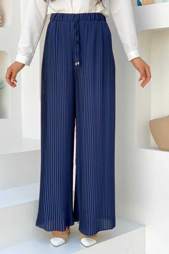 Bel Lastikli Bağcık Görünümlü Piliseli Pantolon 0129 Lacivert