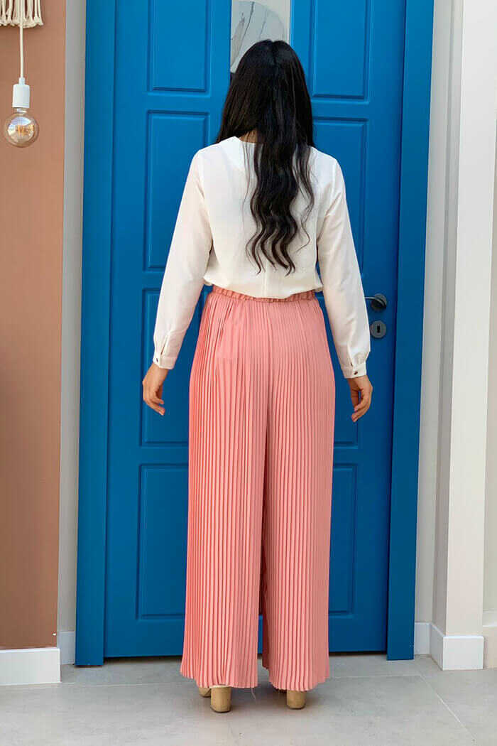 Плиссированные брюки с эластичной талией, детализированной, самоскладывающейся, удобной выкройкой, могут быть предпочтительны для летнего сезона. Это шифоновая креповая ткань 36 38 40 42 44 Диапазон размеров 36 Размеры: Талия: 62 см Высота: 106 см Между другими размерами есть 2 см свободного хода. Размер на наших манекенах 36, при среднем росте 165-170 см, и в пределах 55-60 кг.