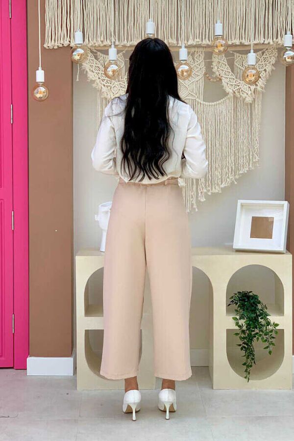 بنطلون مربوط بخصر واسع الساق بطول الكاحل تفاصيل جلد. يمكن تفضيل القالب الكامل بسحاب لموسم الصيف. قماش كريب. هو 36 38 40 42 44 نطاق الحجم. 36 المقاس: الخصر 72 سم الوركين 104 سم الارتفاع 100 سم المنشعب 43 سم عرض الرجل 26 سم هناك 2 سم من اللعب بين أحجامنا الأخرى. حجم العارضات لدينا هو 36 ، وطولها 165-170 سم في المتوسط ، وهي في حدود 55-60 كجم