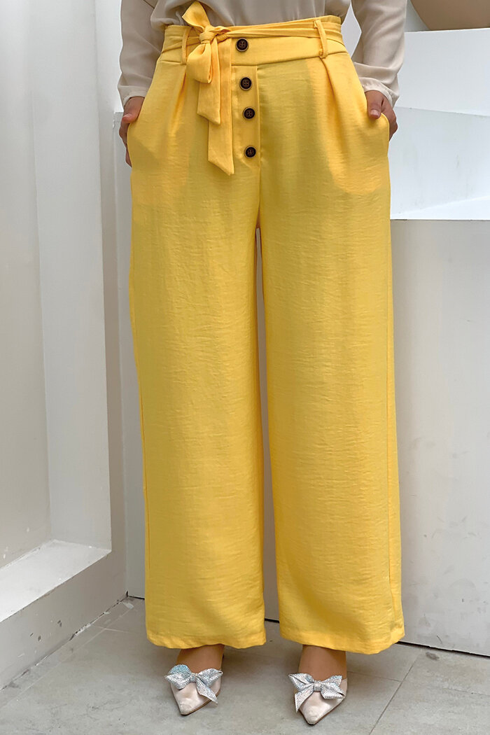 Düğme Detaylı Bel Bağlamalı Cepli Bol Pantolon 0275 Sarı