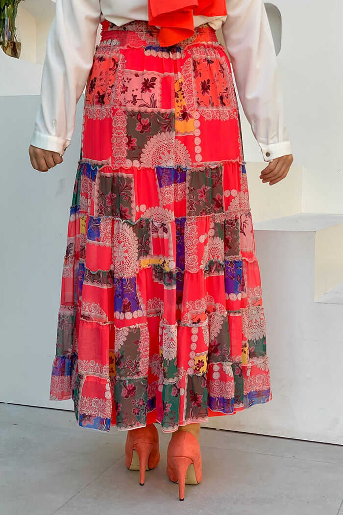 Skirt Waist Sleeved Elastic Detail. It has a ruffle look and a patterned layer. Inside Lined. It is Chiffon Impregnated Fabric. Size 38 40 42 44 46 48. Size 38: Waist 84Cm Length 94Cm