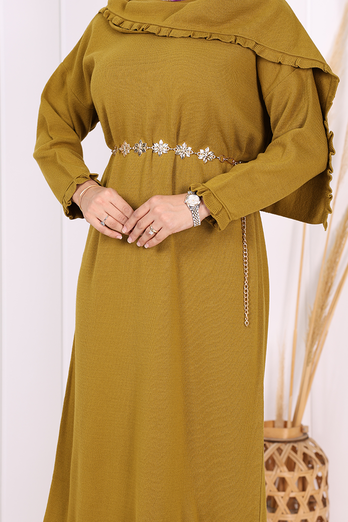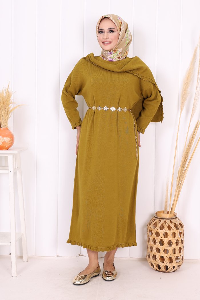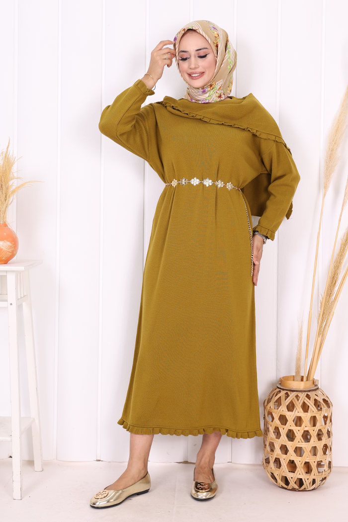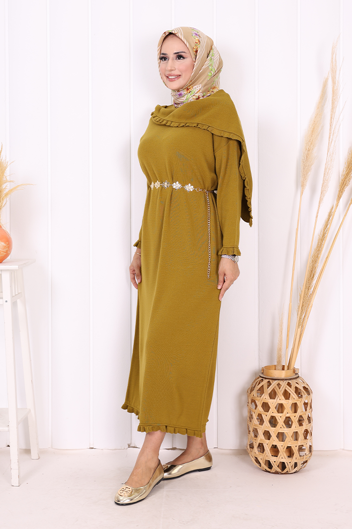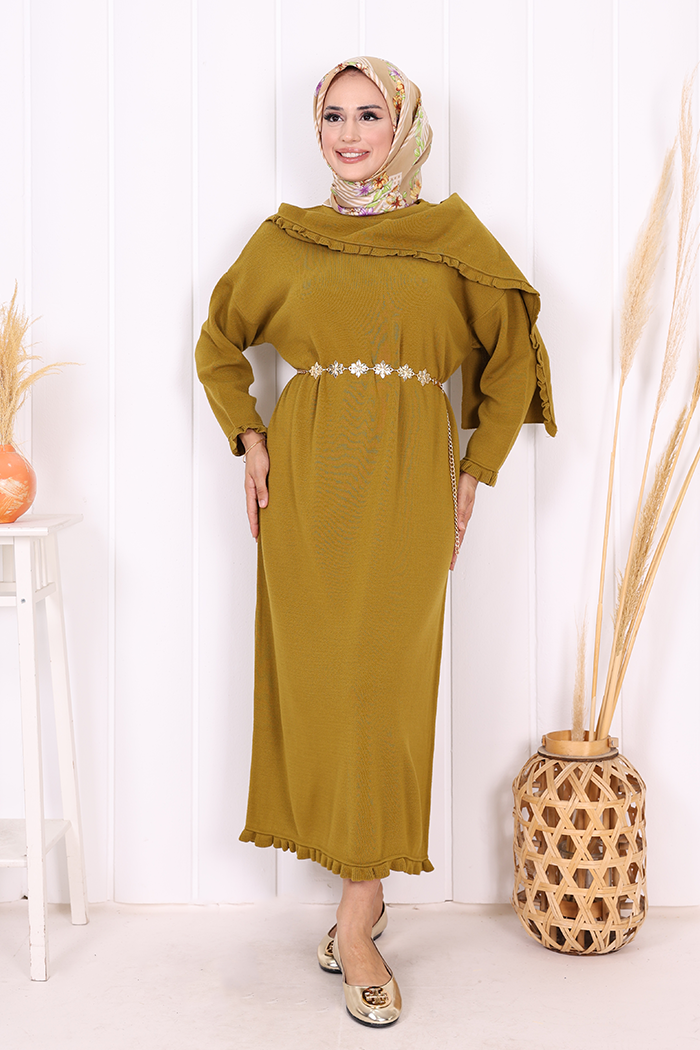 Omuzda Apolet Fırfırlı Triko Elbise 17030 Yağ Yeşili