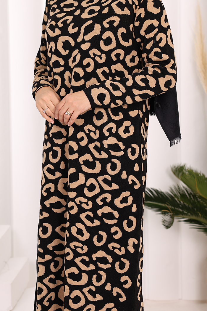 Leopar Desenli Triko Elbise 18193 Siyah-Taba