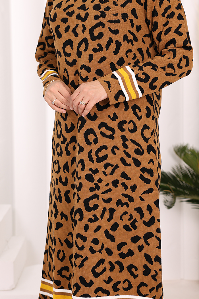 Şerit Detaylı Leopar Desenli Triko Elbise 18200 Taba-Siyah