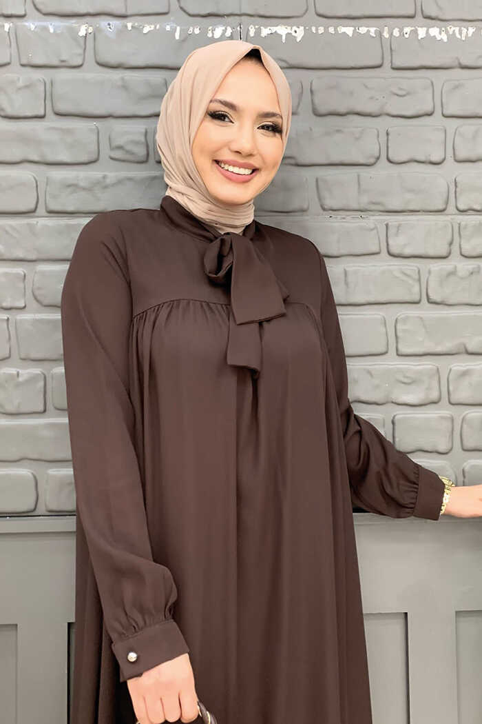 Collar Detail Tailed Sleeve Cuff Шифоновая Туника 2454 Коричневый