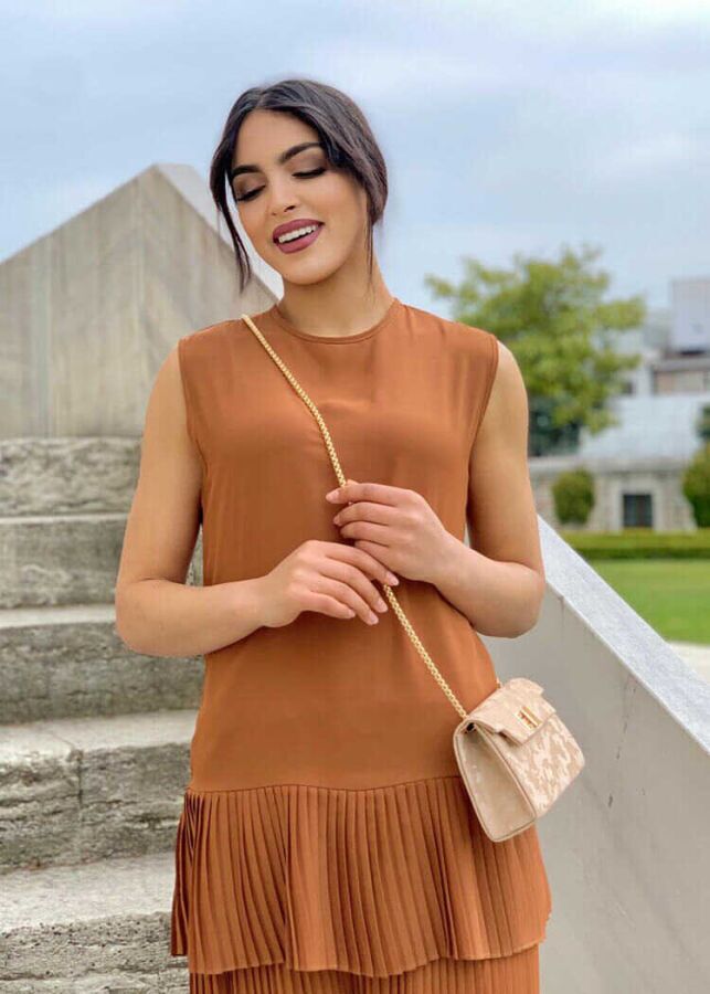 plissierte Tunika mit Rock Null Ärmel. Die Unterseite des Rocks hat Faltendetails. Gerades Modell. Wird hauptsächlich als Unterwäsche für Mannschaften verwendet. Kulin Kreppstoff Größenbereich 38/46. Die Größe unserer Schaufensterpuppen beträgt 38, sie sind im Durchschnitt 165–170 cm groß und wiegen zwischen 55–60 kg.