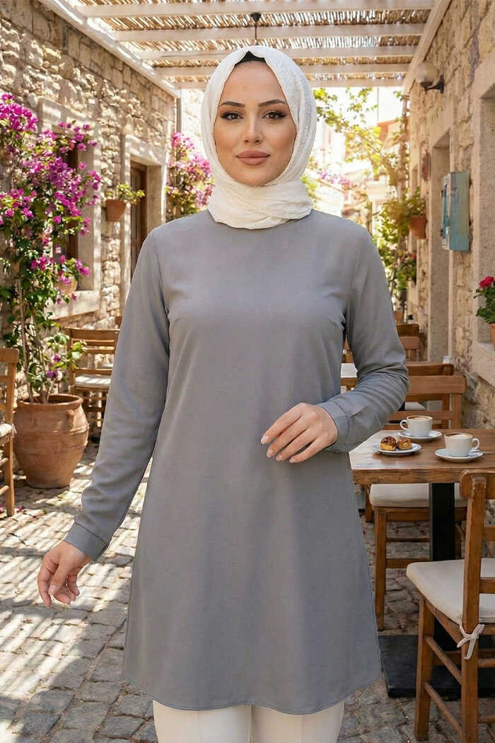 Crew Neck Long Tunic 2649 Gray With Sleeve Cuffs Buttons - 1Crew Neck Long Tunic 2649 Gray With Sleeve Cuffs Buttons - 2