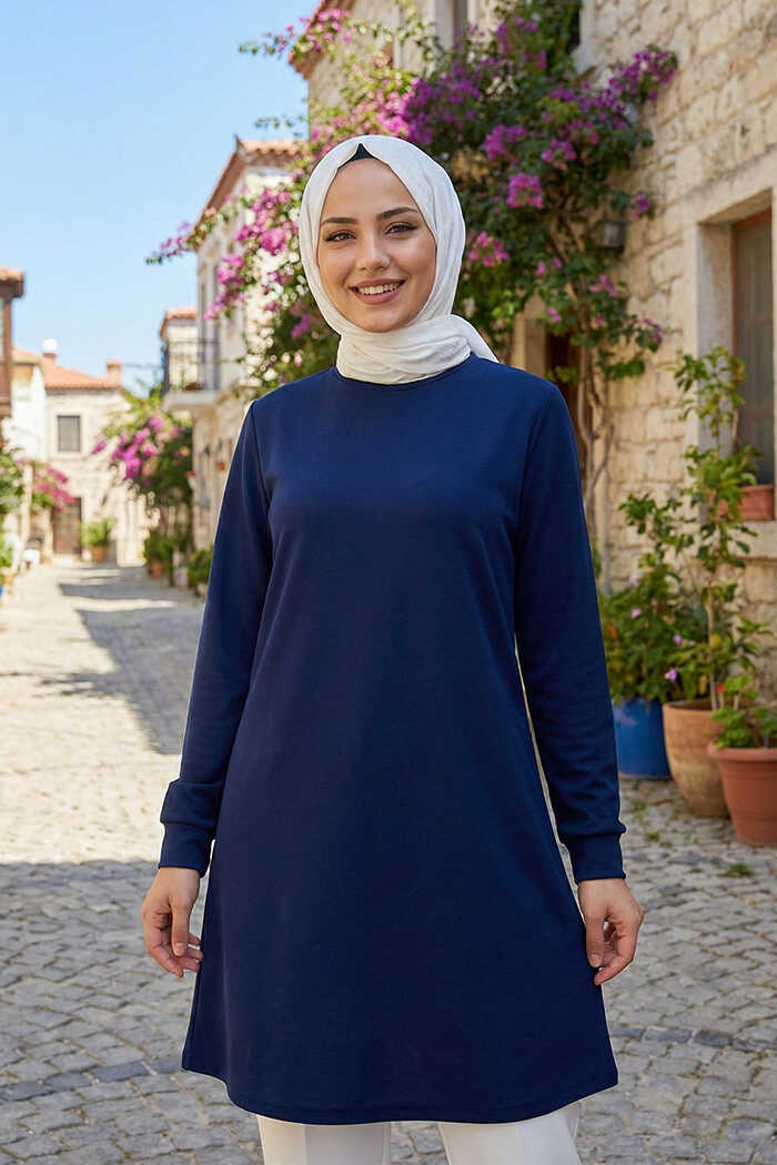 Kol Manşetleri Düğmeli Bisiklet Yaka Uzun Tunik 2649 Lacivert
