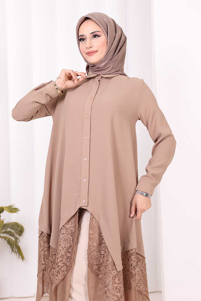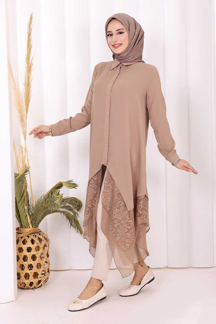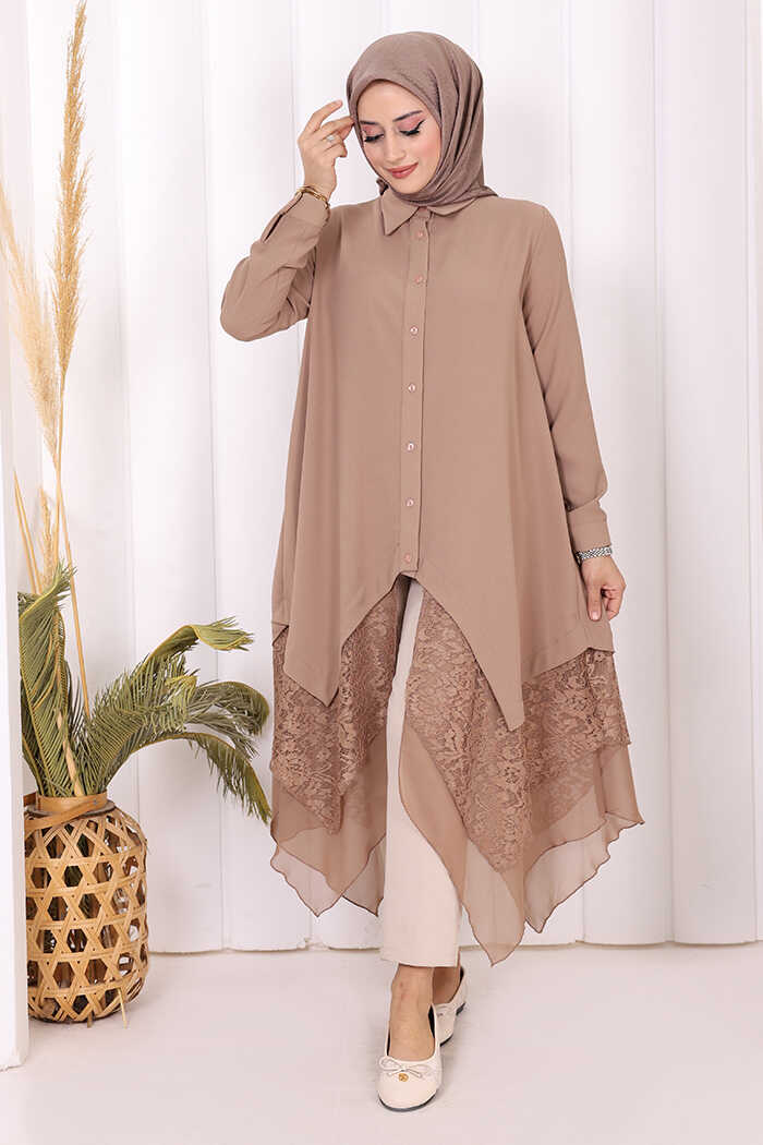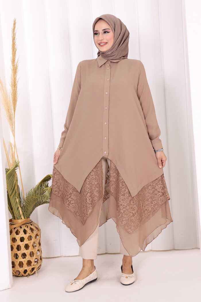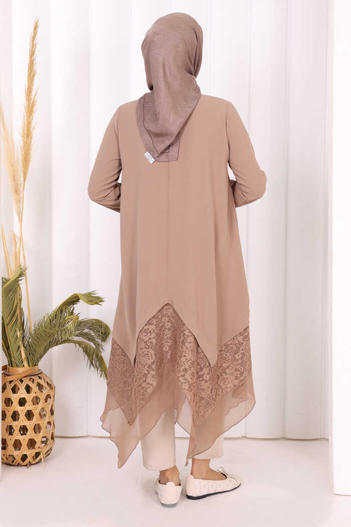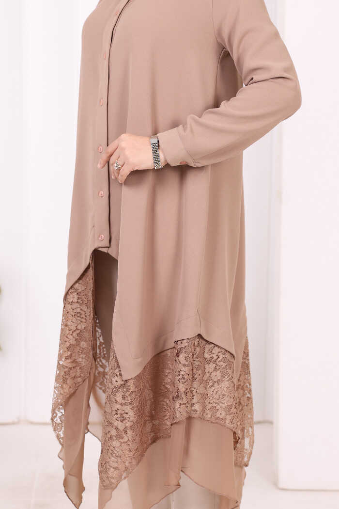 Dantel Ve Şifon Detaylı Asimetrik Kesim Tunik 2758 Vizon