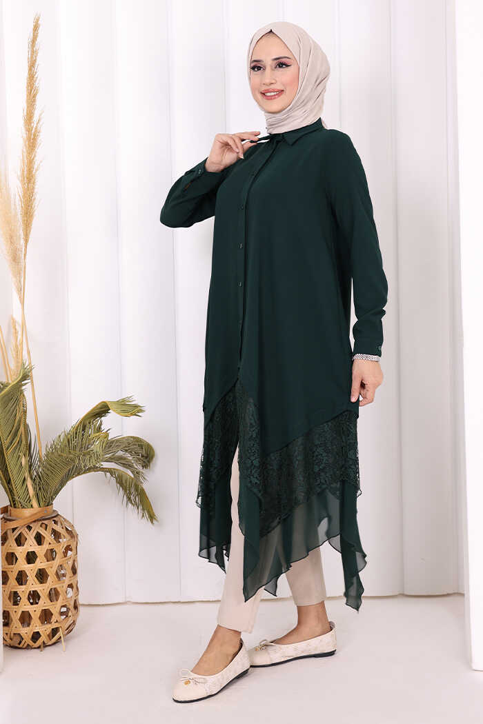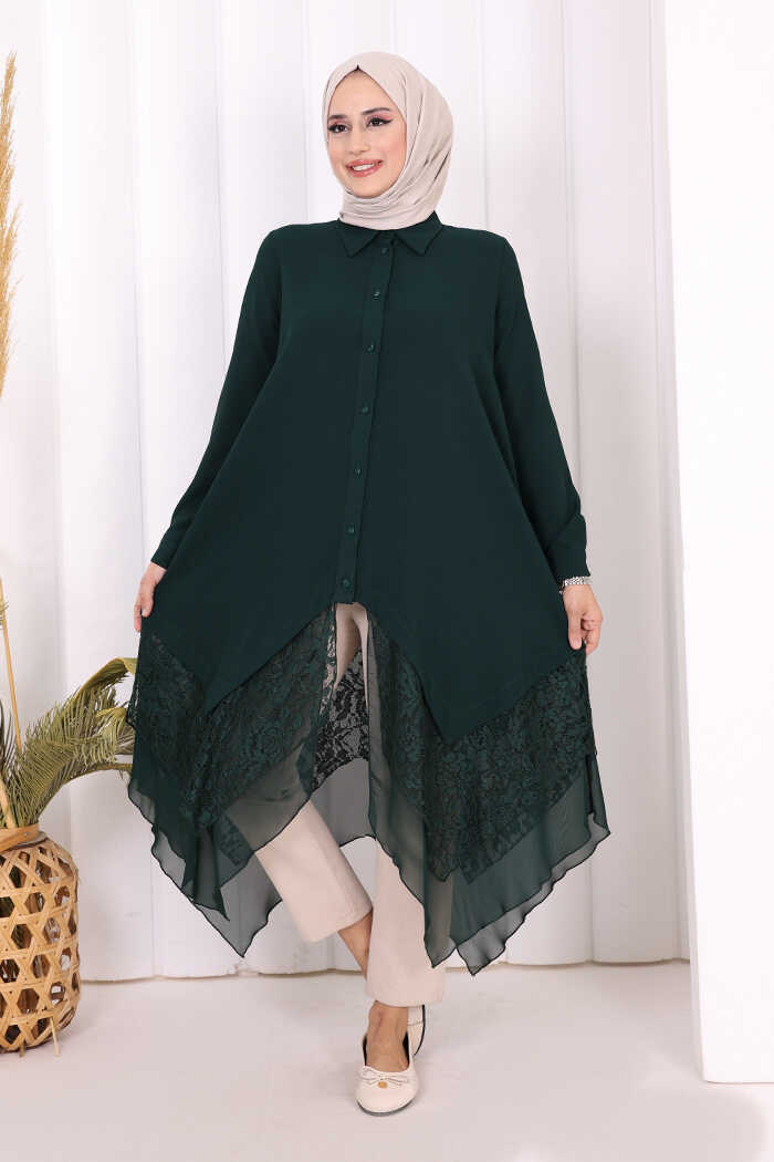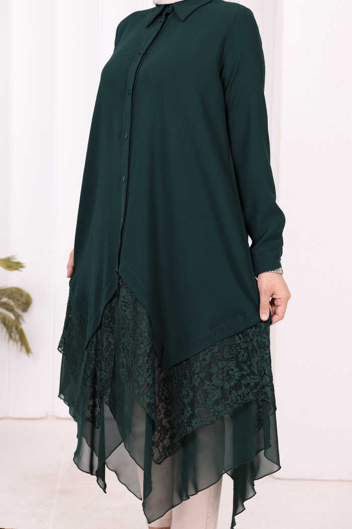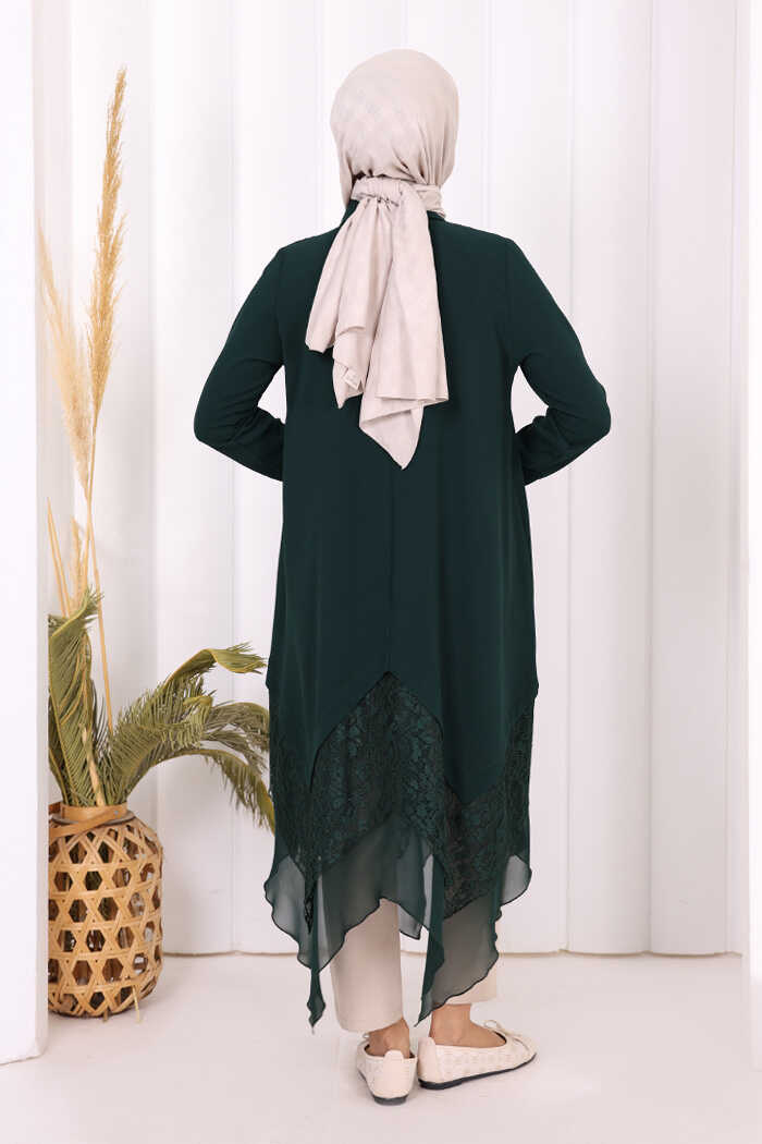 Dantel Ve Şifon Detaylı Asimetrik Kesim Tunik 2758 Zümrüt