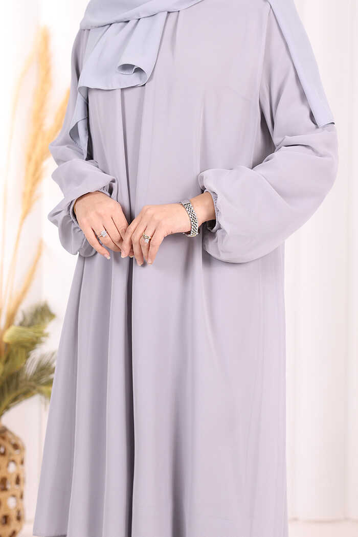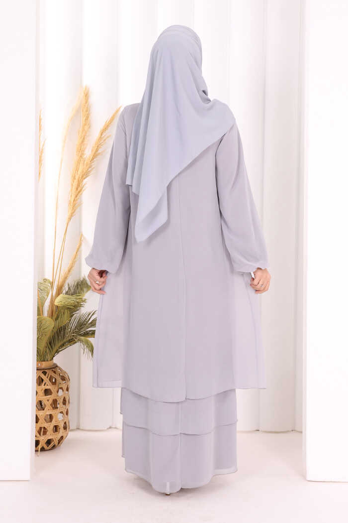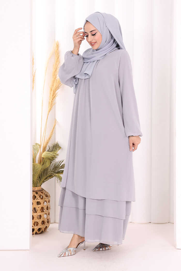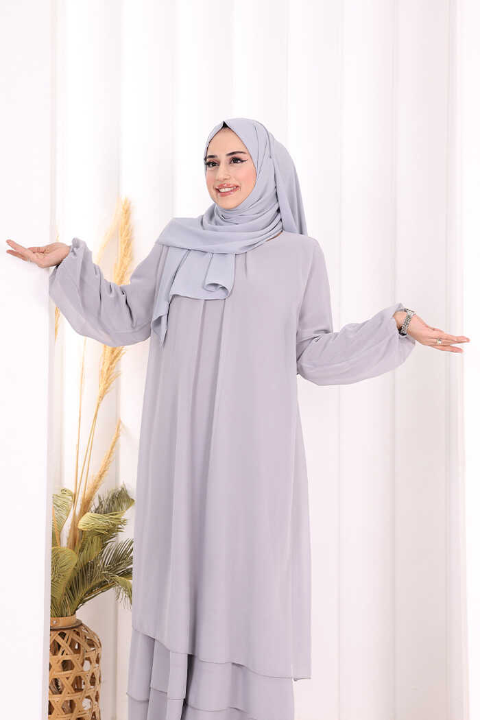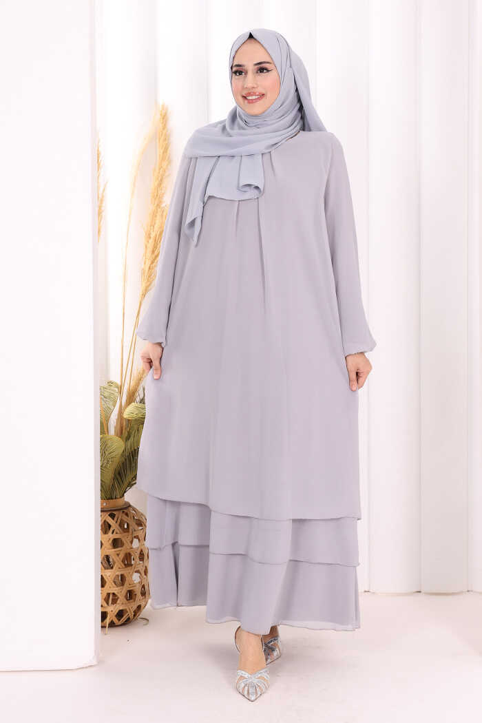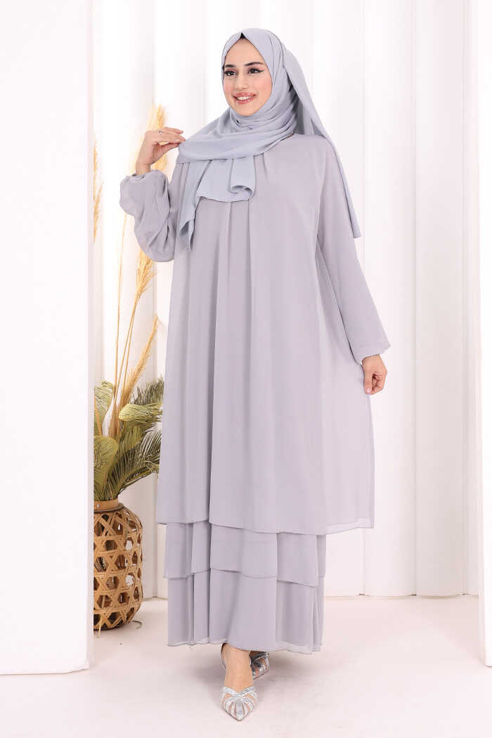 Kat Kat Görünüm Kol Manşetleri Lastikli Şifon Elbise 3060 Gri