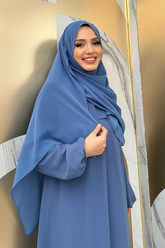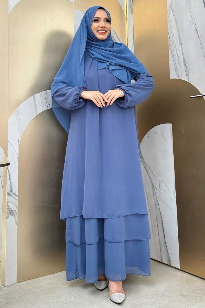 Kat Kat Görünüm Kol Manşetleri Lastikli Şifon Elbise 3060 İndigo