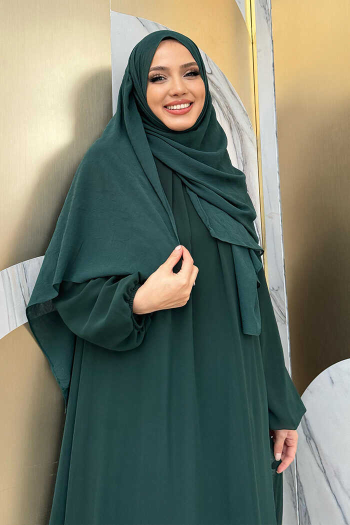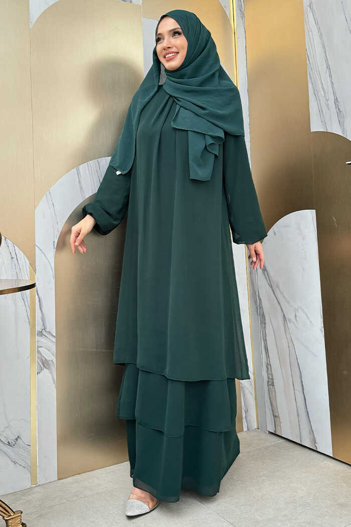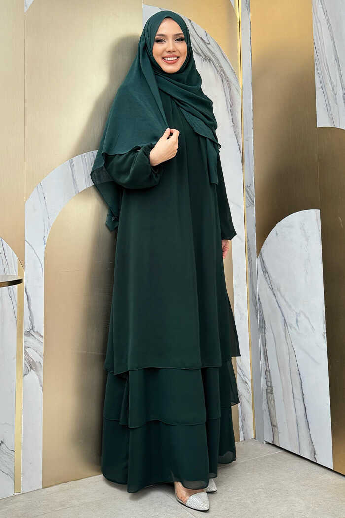 Kat Kat Görünüm Kol Manşetleri Lastikli Şifon Elbise 3060 Zümrüt