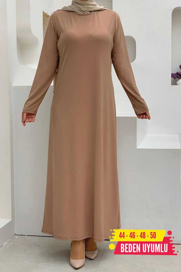 Large Size Sandy Dress, Zero Collar, Straight Cut. You can use it as underwear. No belt. Unlined comfortable fit can be preferred in all seasons. Sandy Fabric. It is a standard, 44-50 size is compatible. Product Dimensions: Shoulder 41 cm Arm Length 59 cm Biceps 36 cm Width 114 cm Length 129 cm. The size on our mannequins is 36. They are 165-170 cm in length on average, and they are in the range of 55-60 kg.