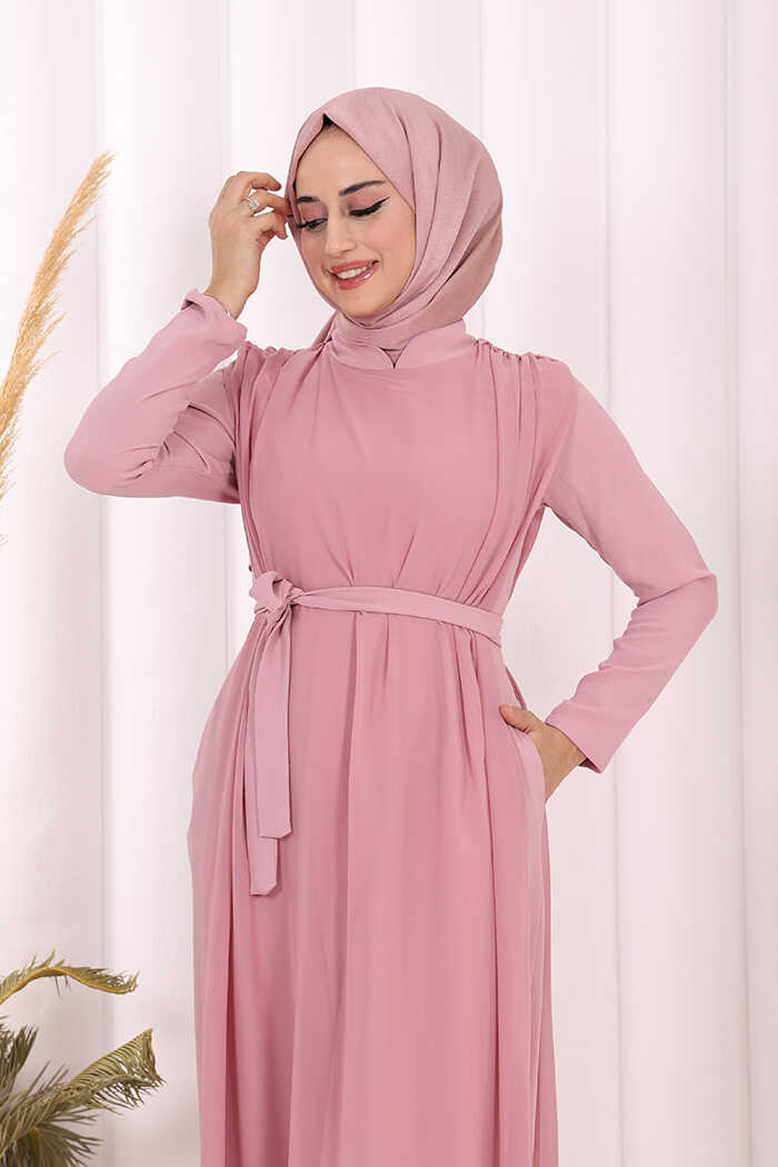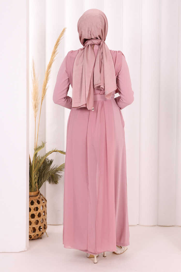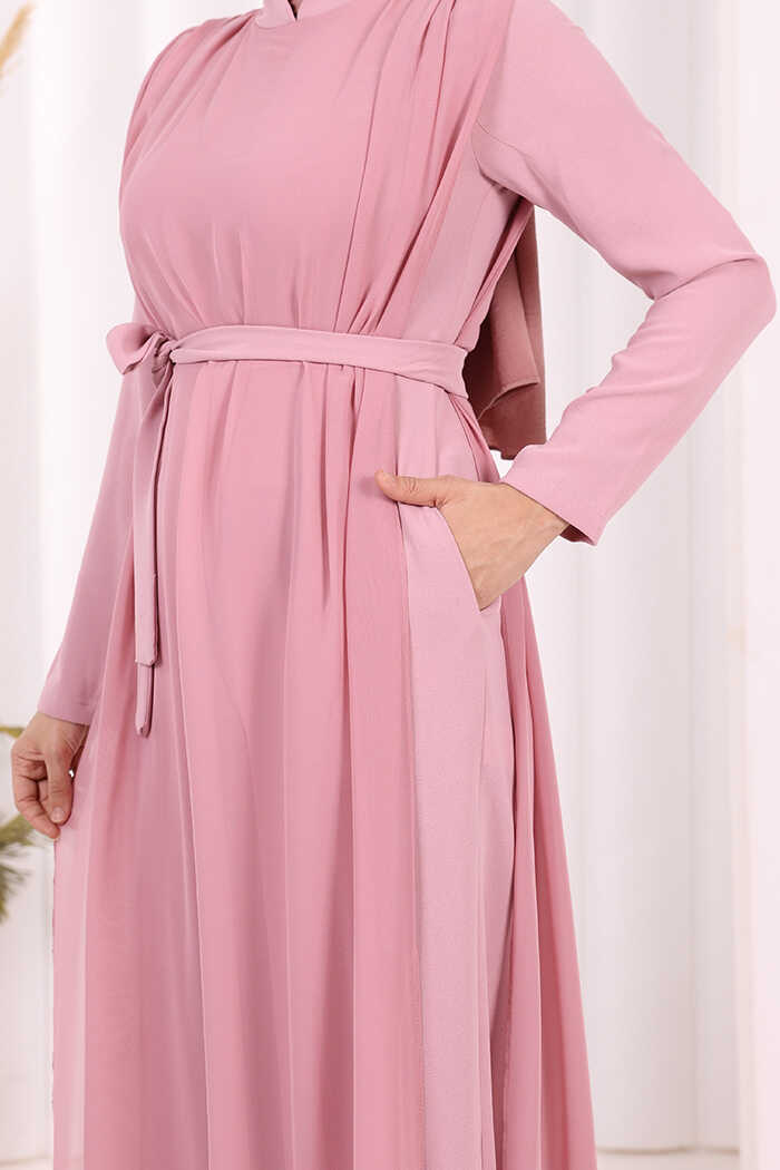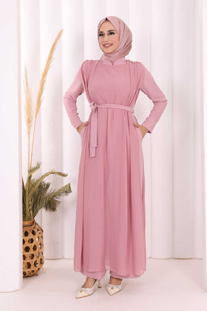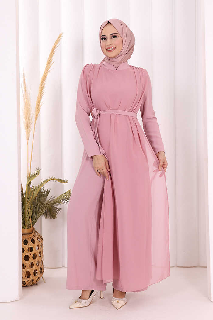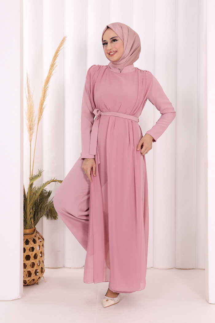 Şifon Pelerin Detay Bel Kuşaklı Tulum 3330 Pudra