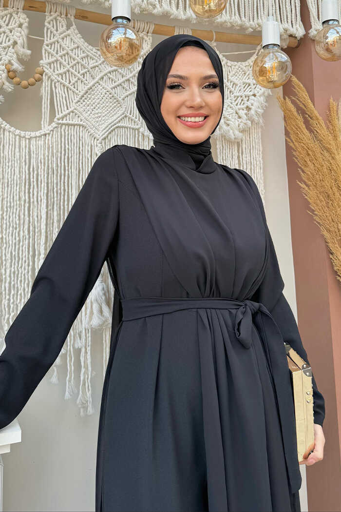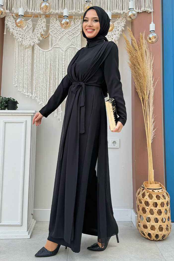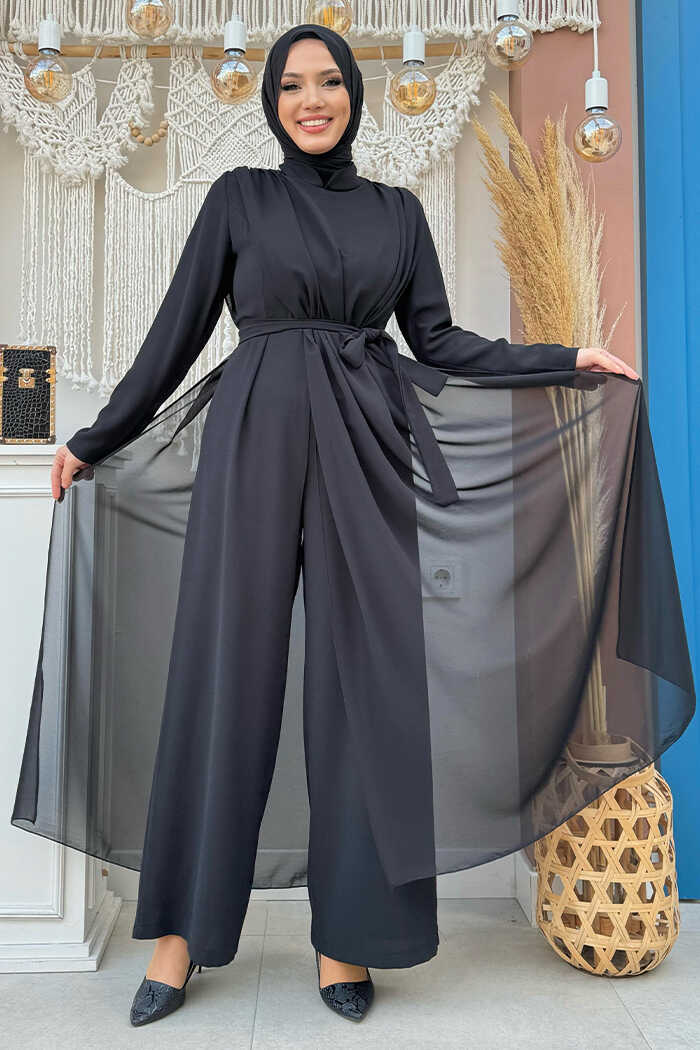 Şifon Pelerin Detay Bel Kuşaklı Tulum 3330 Siyah