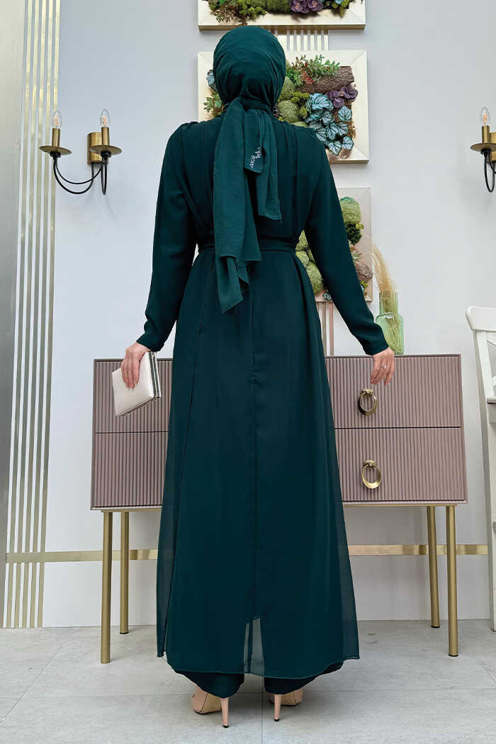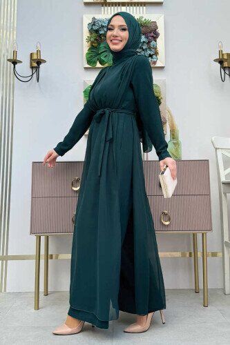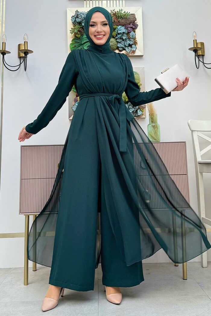 Şifon Pelerin Detay Bel Kuşaklı Tulum 3330 Zümrüt