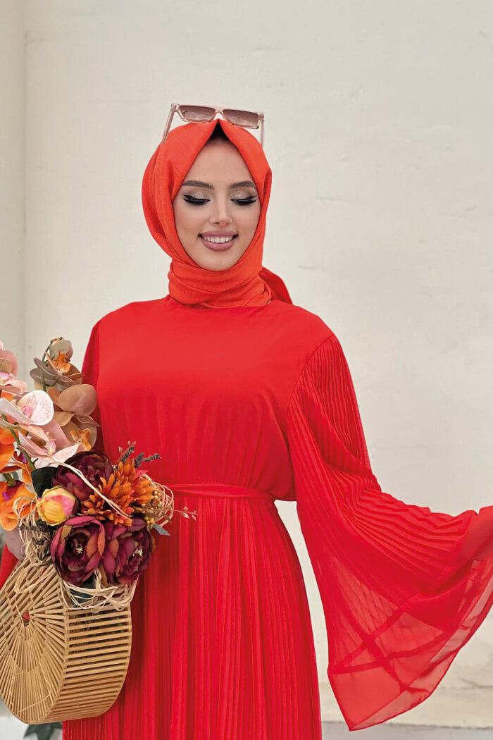Piliseli Fırfır Görünümlü Astarlı Şifon Elbise 3404 Turuncu