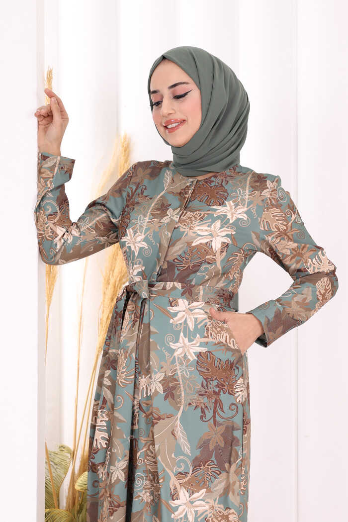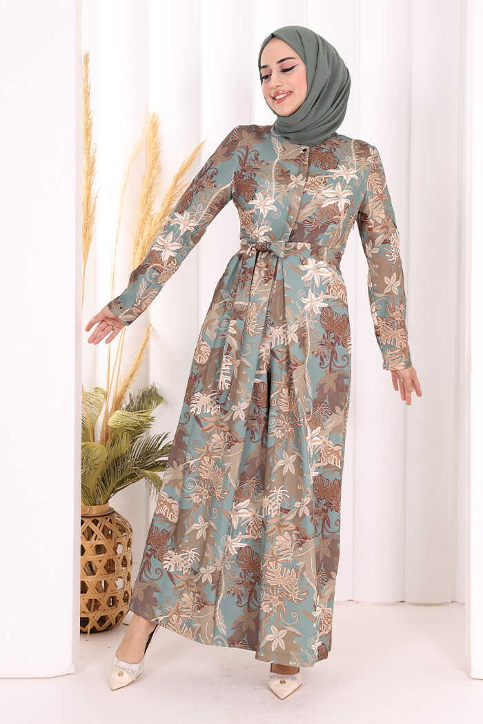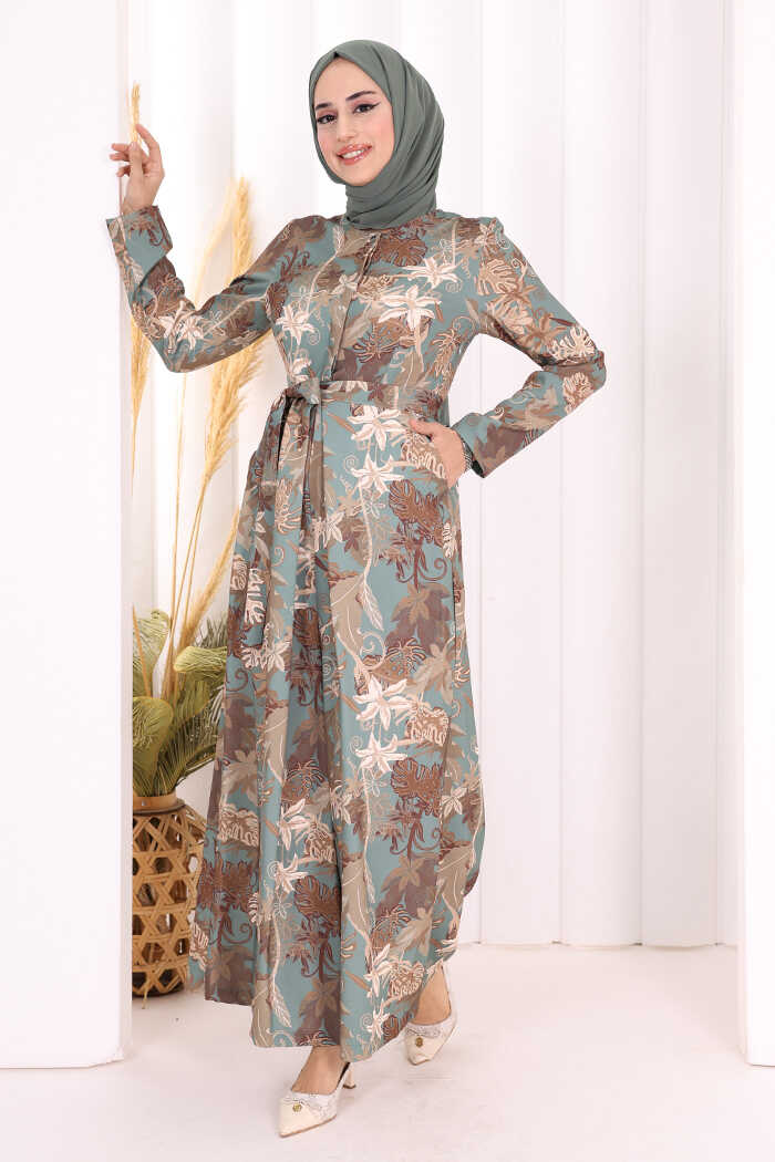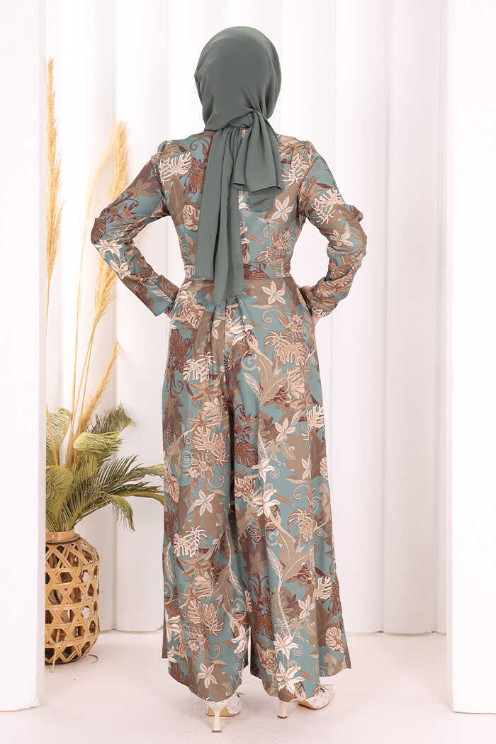 Göğüs Kısmı Gizli Düğmeli Bel Kuşaklı Baskı Desenli Tulum 3486 Mint