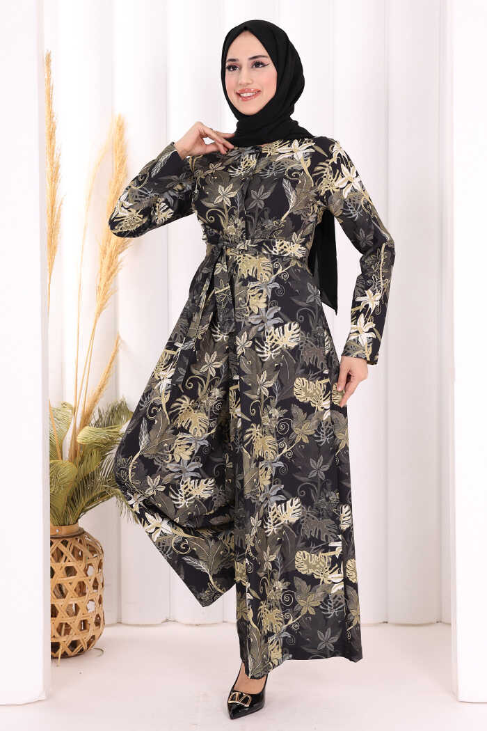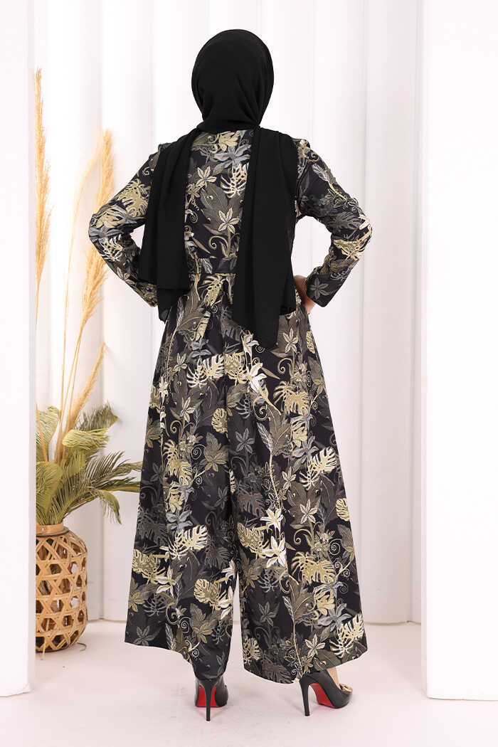 Göğüs Kısmı Gizli Düğmeli Bel Kuşaklı Baskı Desenli Tulum 3486 Siyah