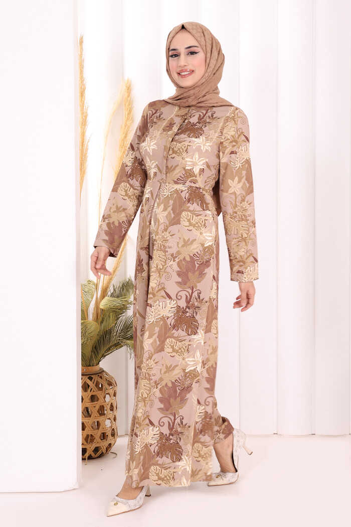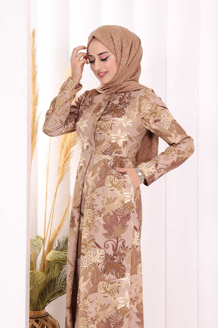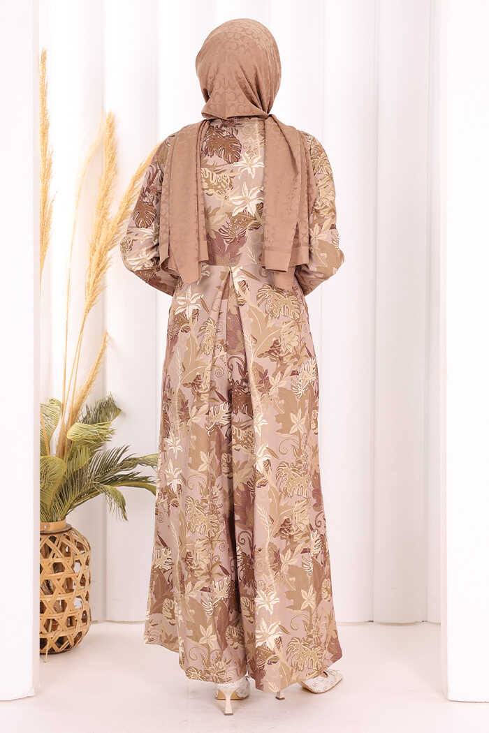 Göğüs Kısmı Gizli Düğmeli Bel Kuşaklı Baskı Desenli Tulum 3486 Vizon