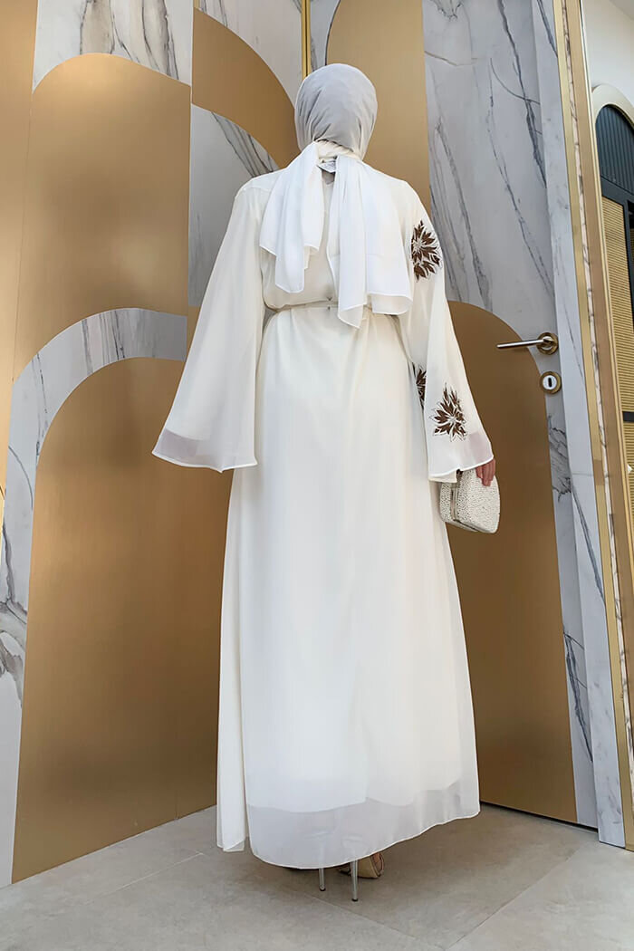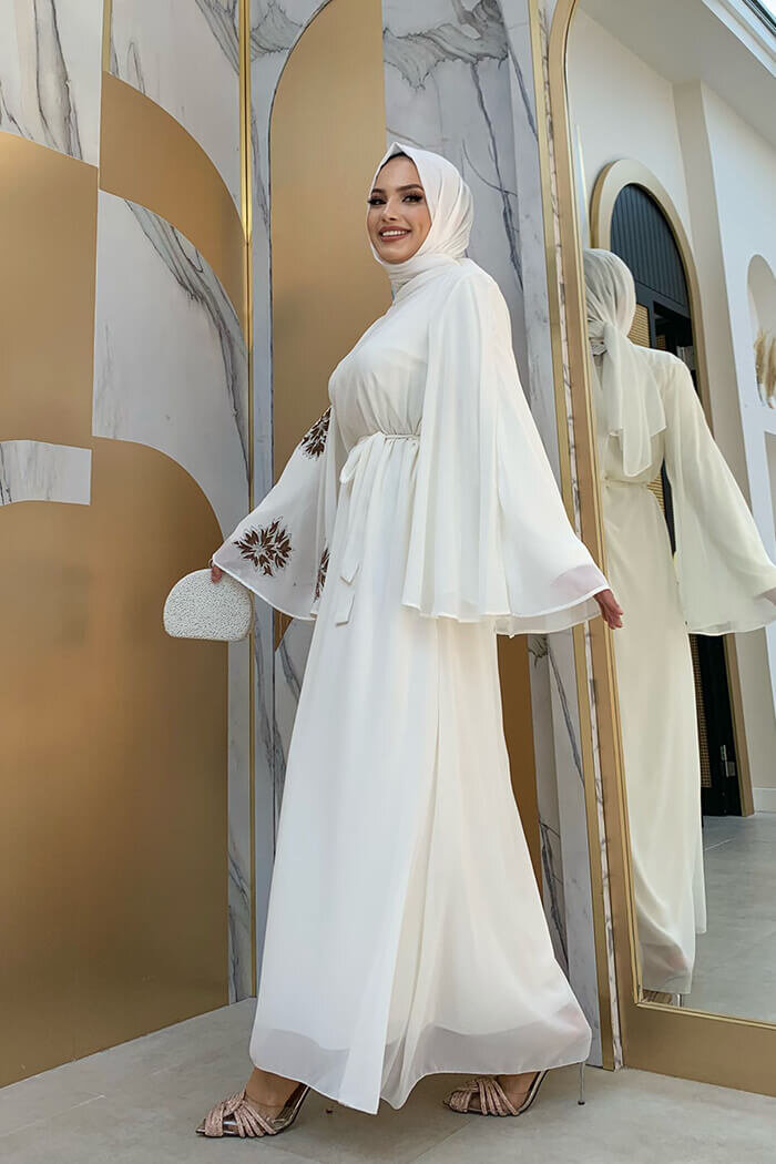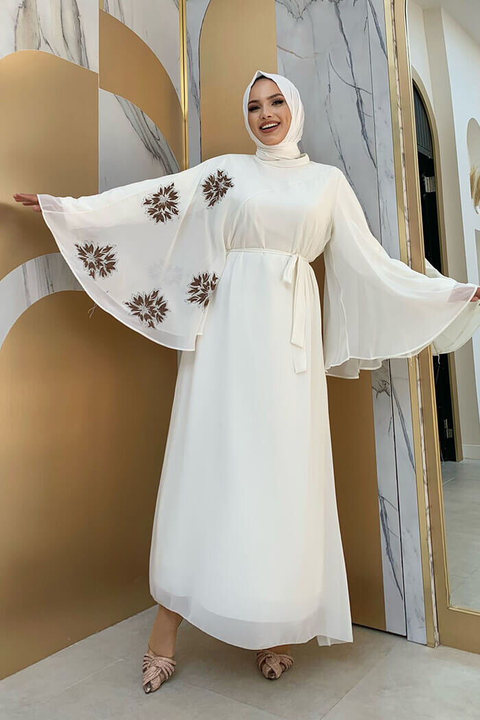 Yarasakol Tek Kol Baskılı Şifon Astarlı Abiye Elbise 3539 Ekru