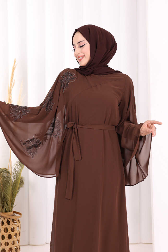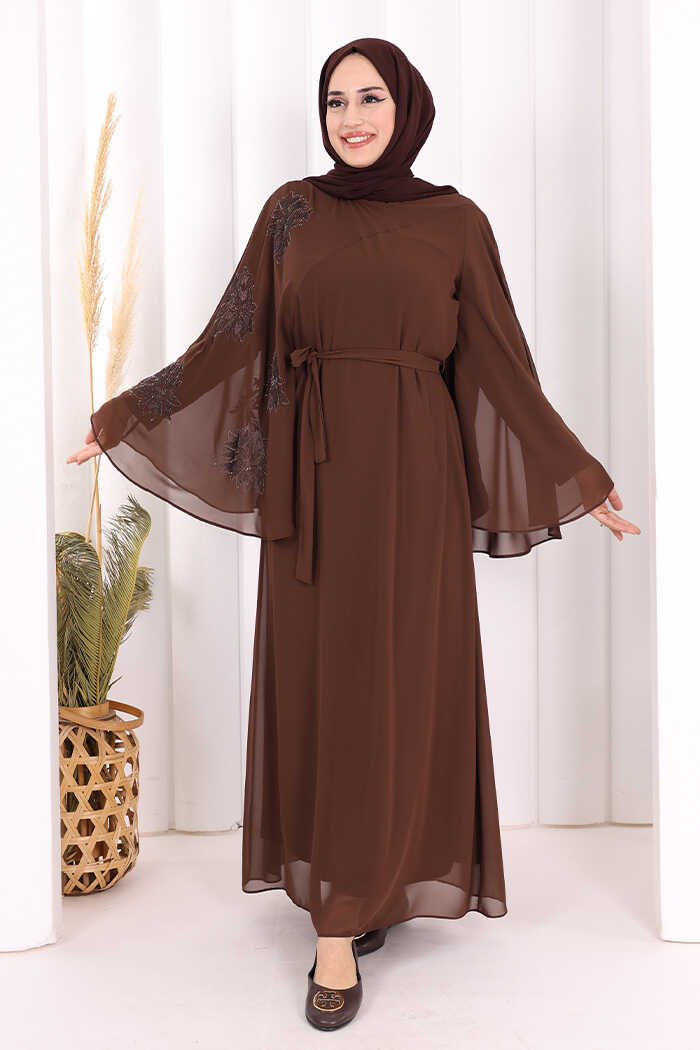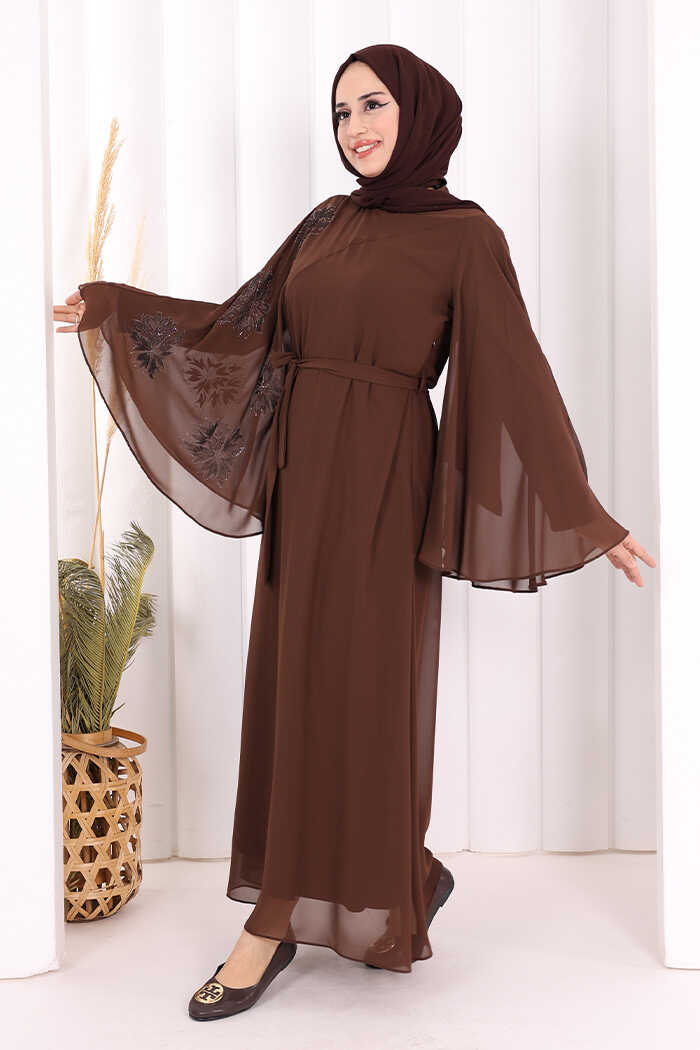 Yarasakol Tek Kol Baskılı Şifon Astarlı Abiye Elbise 3539 Kahverengi