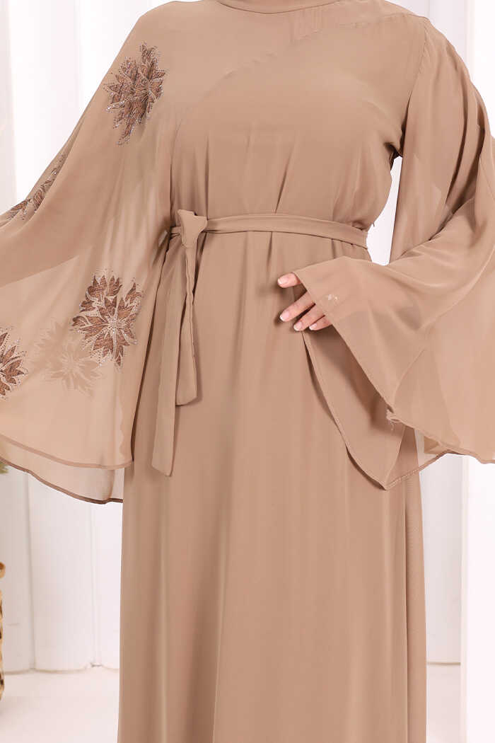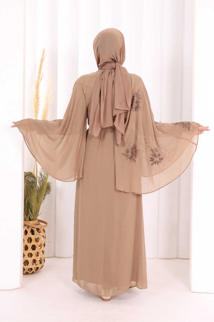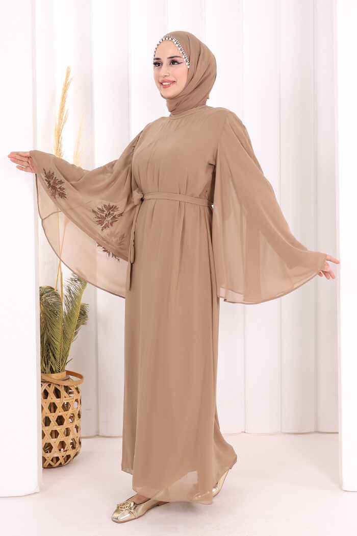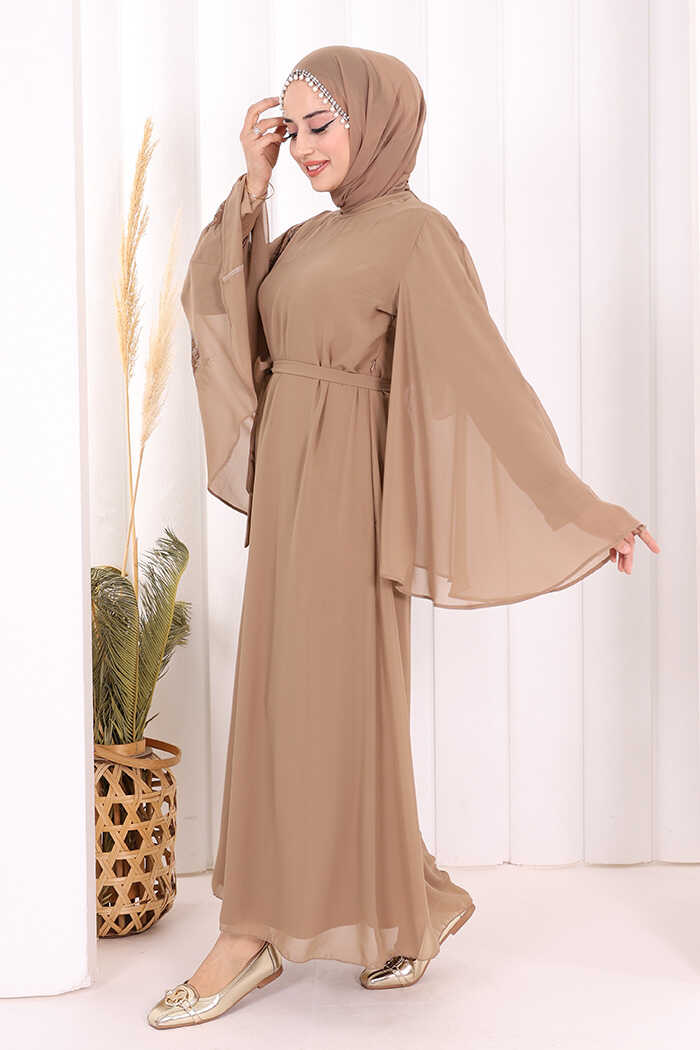 Yarasakol Tek Kol Baskılı Şifon Astarlı Abiye Elbise 3539 Vizon