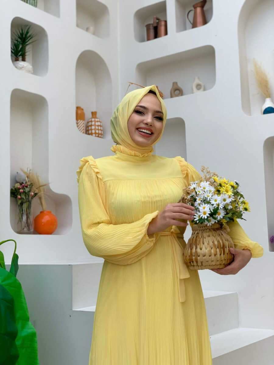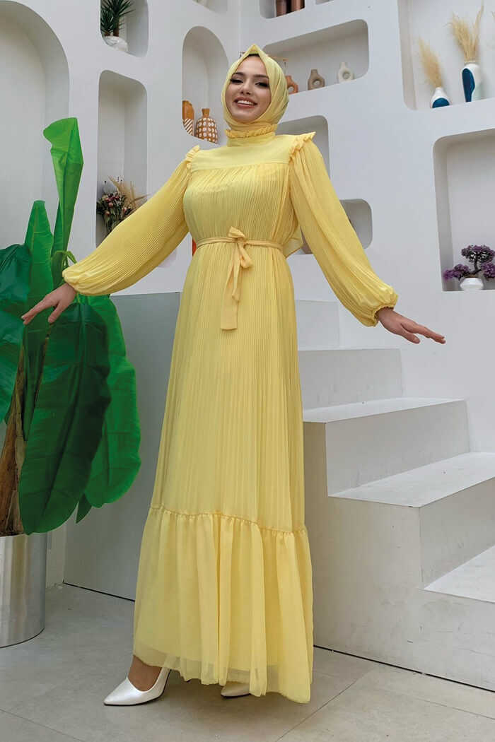 Piliseli Fırfır Görünümlü Bel Kuşaklı Şifon Elbise 3628 Sarı