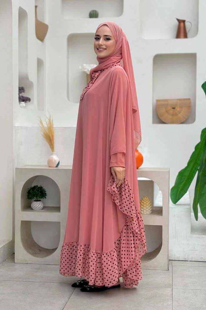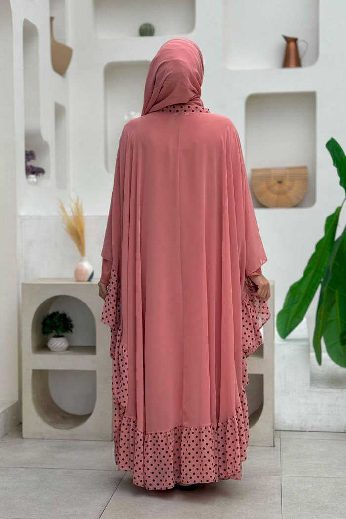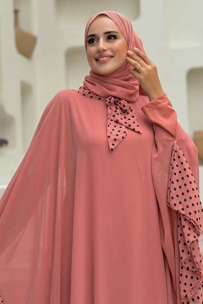 Benekli Yaka Detay Şifon Pelerinli Elbise Takım 3643 Pudra