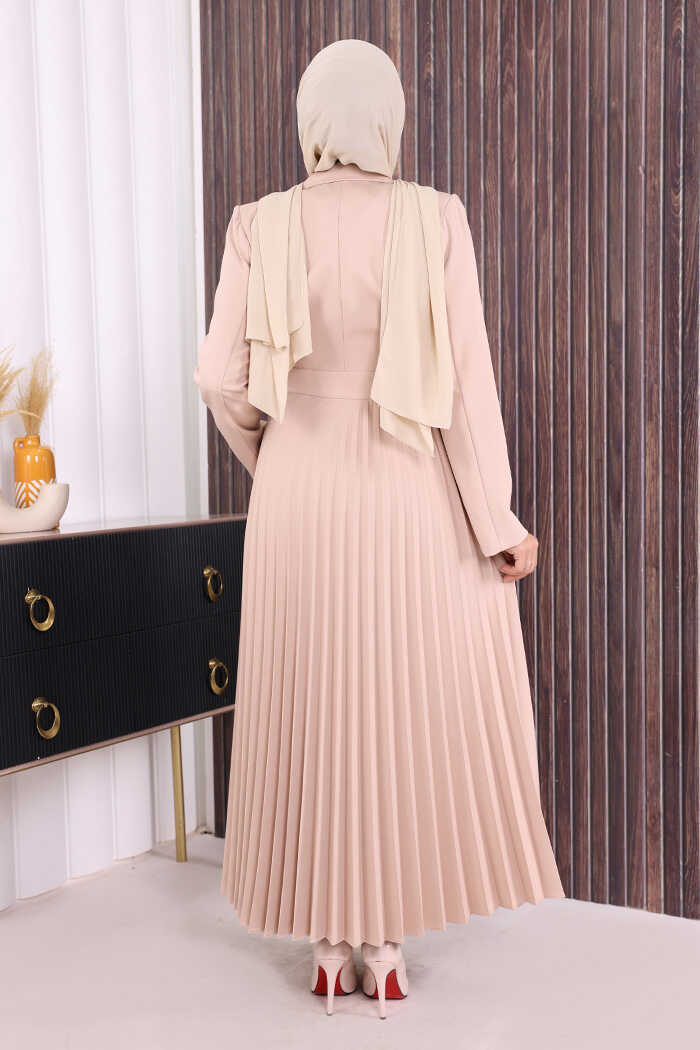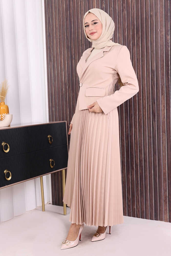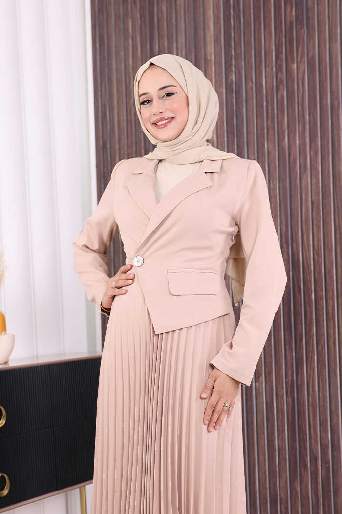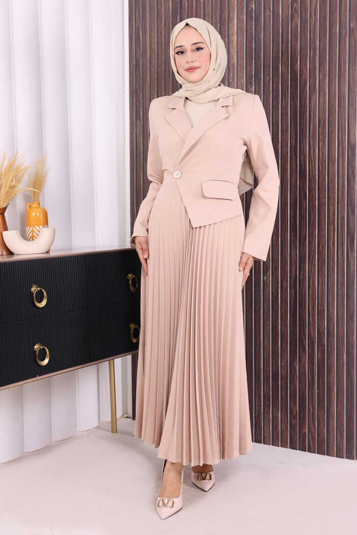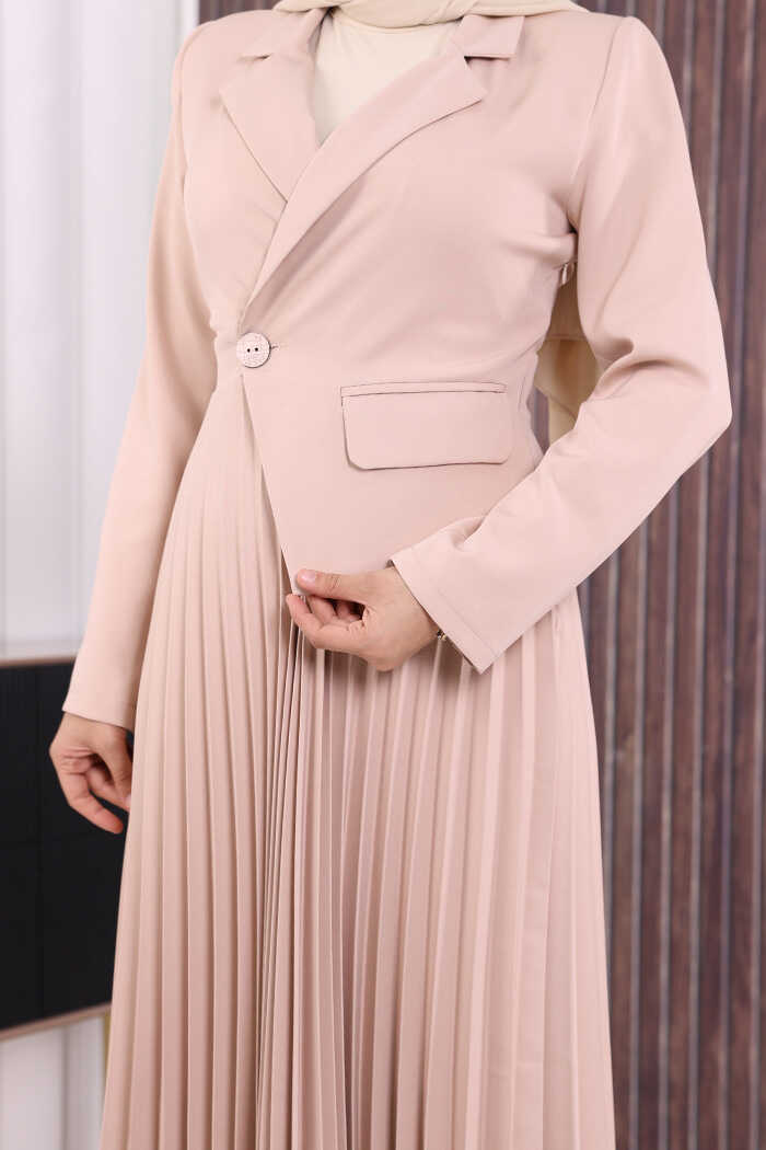 CEKET GÖRÜNÜMLÜ ETEĞİ PİLİSELİ ELBİSE