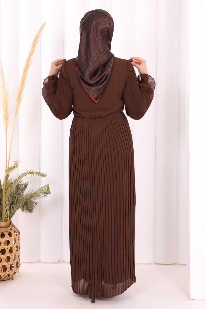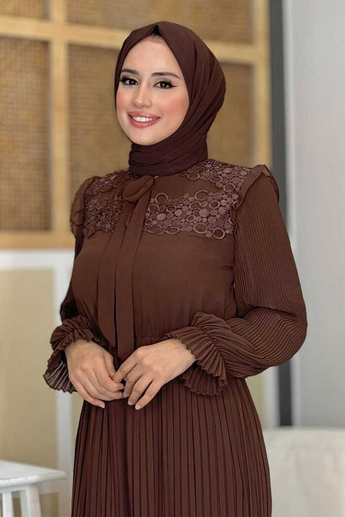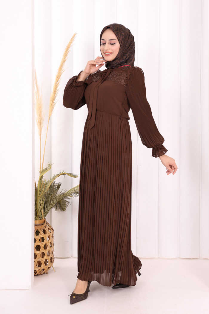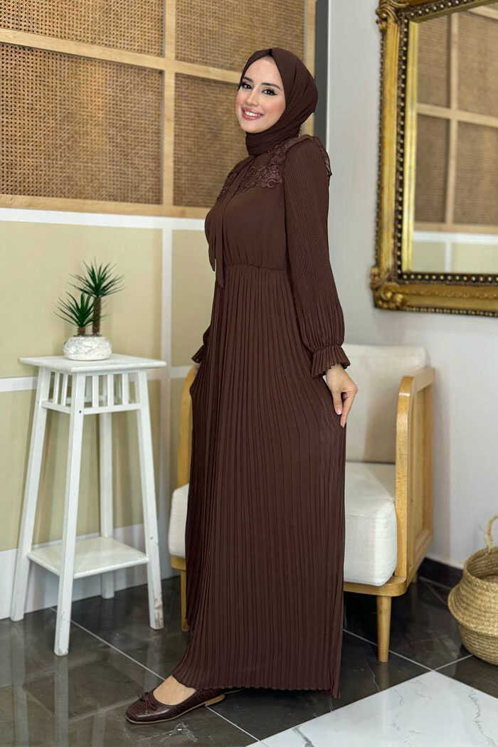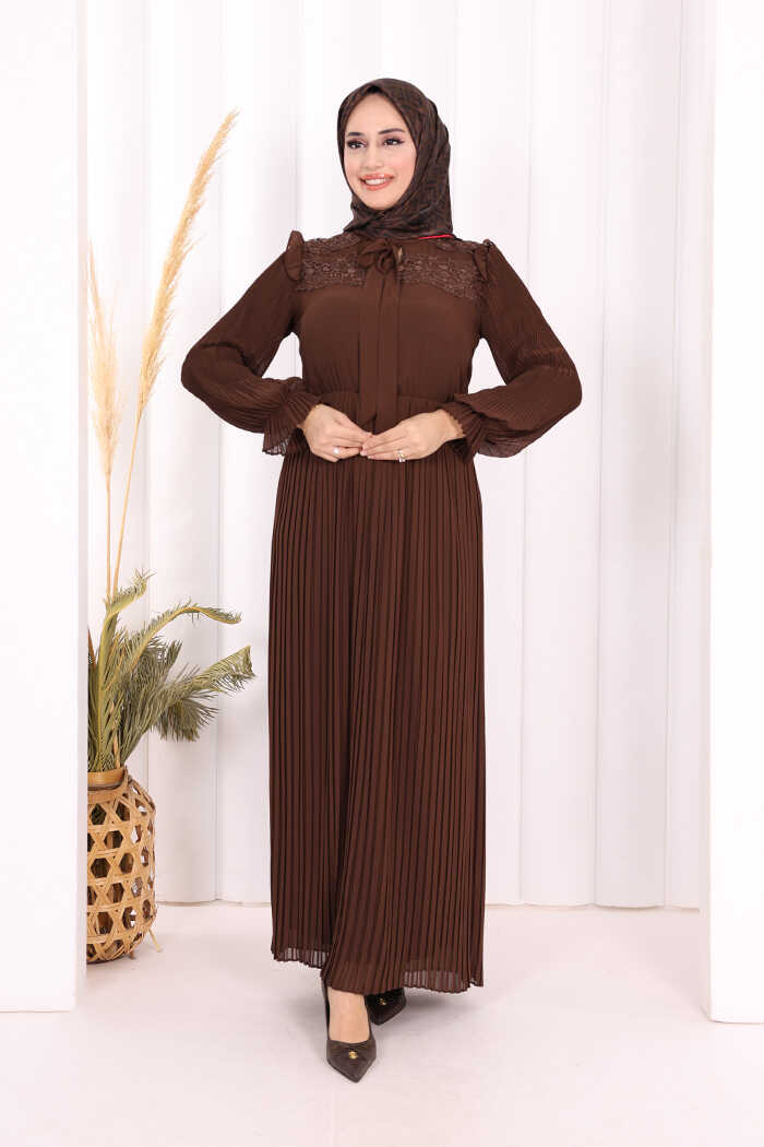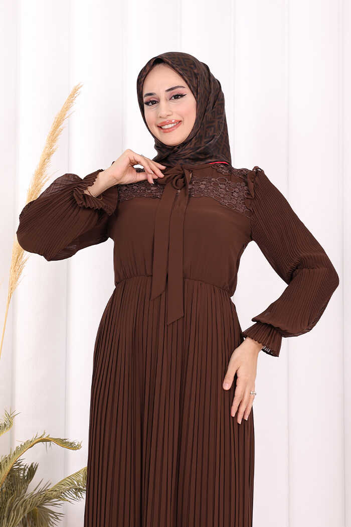 Piliseli Omuz Kısmı Dantel Görünümlü Yaka Detay Elbise 3726 Kahverengi