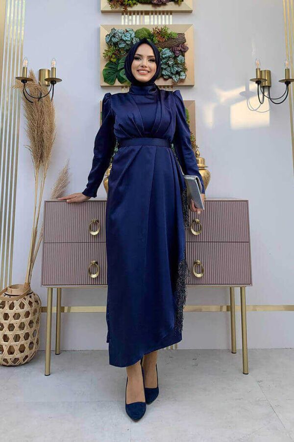 فستان سهرة من الساتان بتفاصيل شرابة وحزام وإكسسوارات 3763 أزرق كحلي
