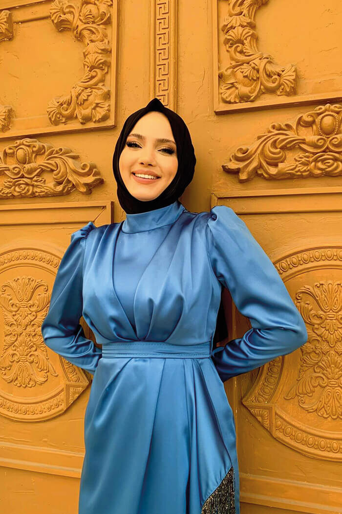 Skirt Tassel Detail Belt Accessory Satin Evening Dress 3763 Indigo