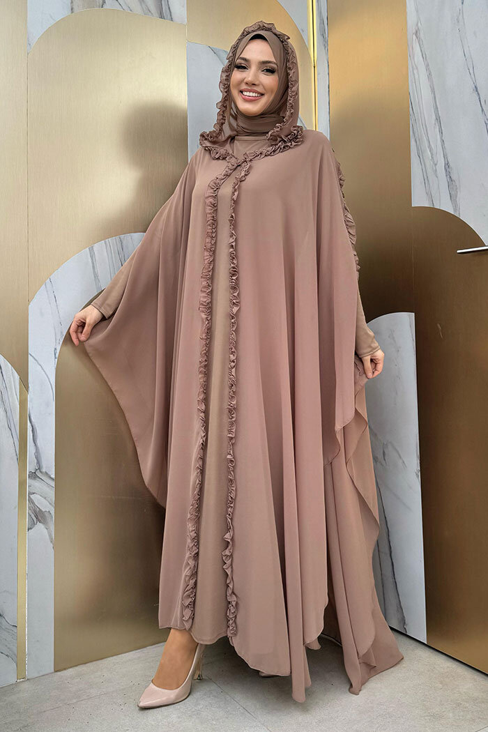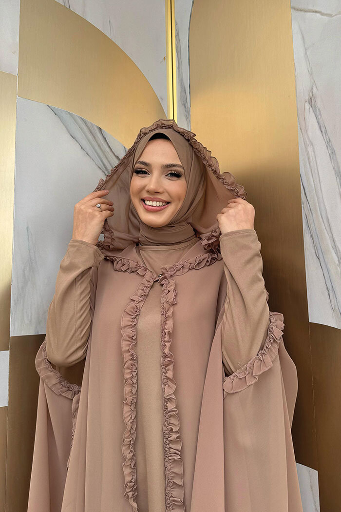 Kapişonlu Abayalı Elbise Takım 3778 Vizon