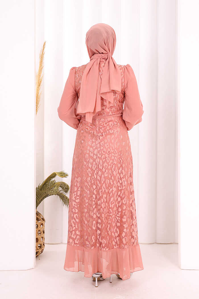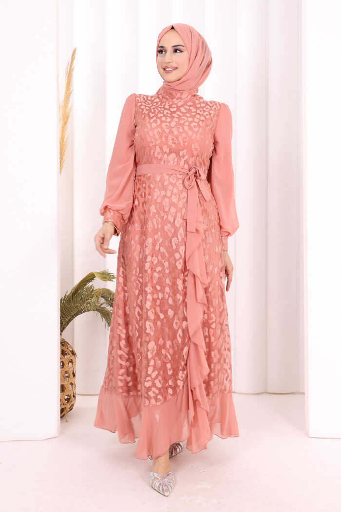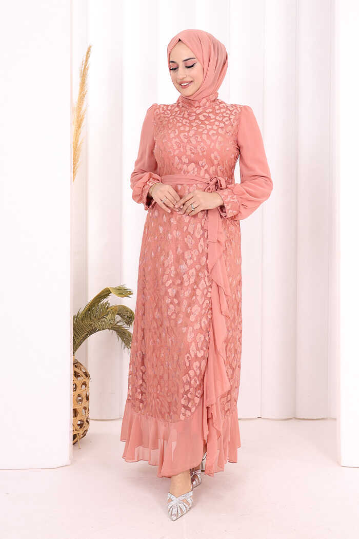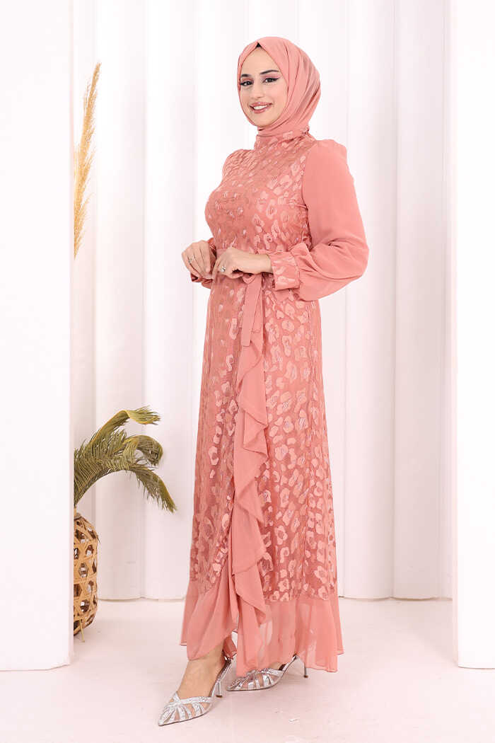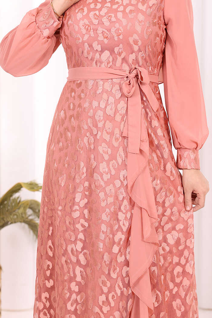 Dantel Görünümlü Şifon Fırfır Detay Elbise 3783 Pudra
