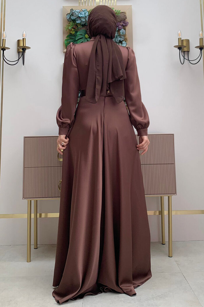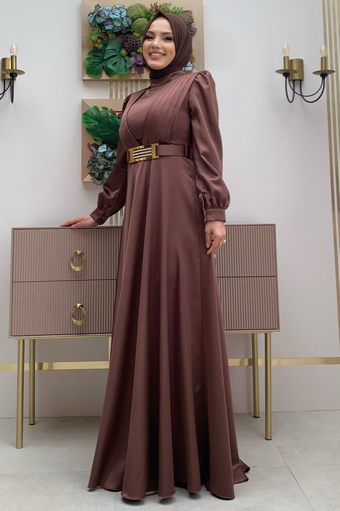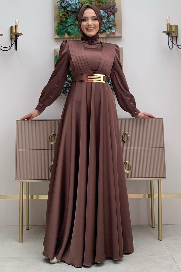 Göğüs Kısmı Kat Şerit Detay Bel Kemer Aksesuarlı Abiye Elbise 3792 Kahverengi
