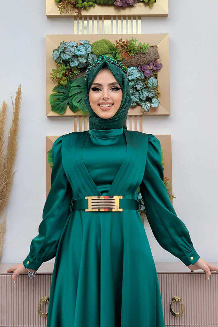 Göğüs Kısmı Kat Şerit Detay Bel Kemer Aksesuarlı Abiye Elbise 3792 Zümrüt