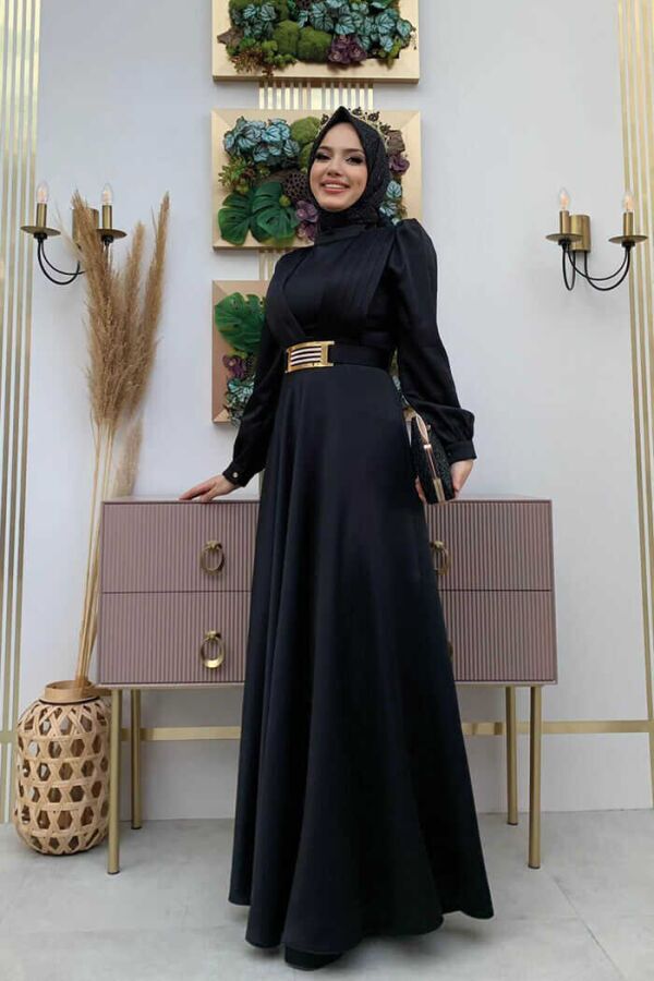Evening Dress, Chest Part, Layered Cross Piece, Embedded. Arm Cuffs Should Be Buttoned. The Back is Zippered. Waist Metal Buckle Belt Accessory. Satin Fabric. Size 38 40 42 44 46 48. Size 38: Shoulder 37 cm Arm 62 cm Biceps 34 cm Width 80 cm Waist 60 cm Height 150 cm There is 2 cm of play between our other sizes. The size on our mannequins is 38. They are 165-170 cm in length on average, and they are in the range of 55-60 kg.