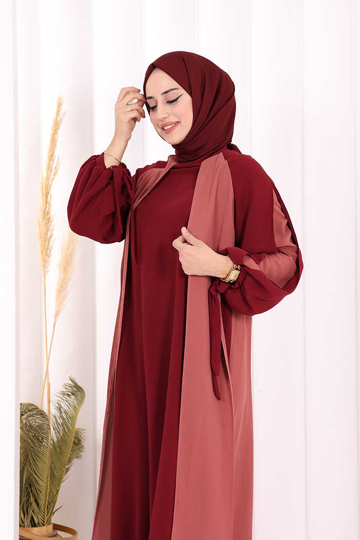 İki Renkli Parça Detay Balonkol Görünümlü Elbise 3799 Gül Kurusu
