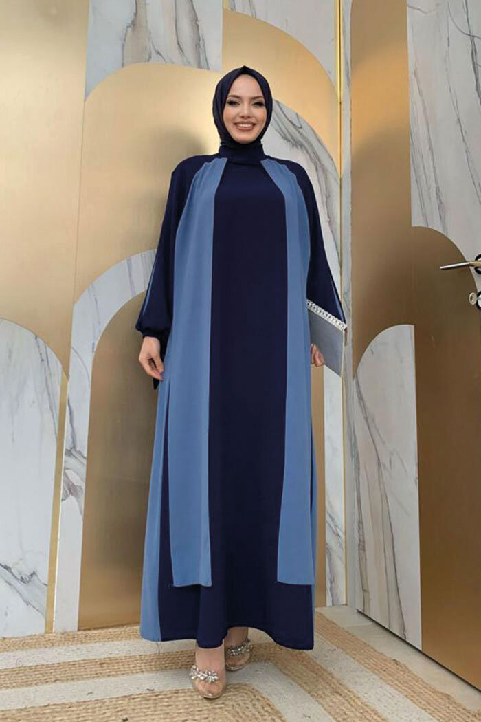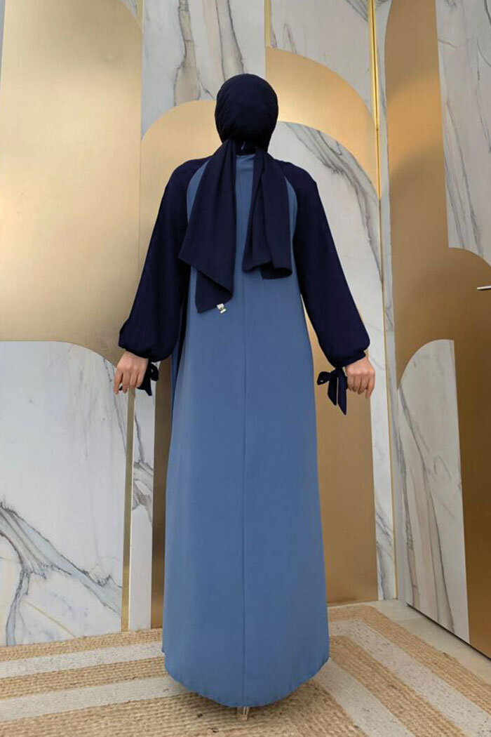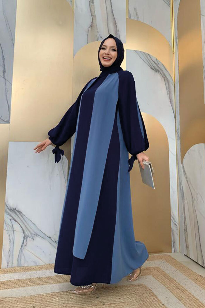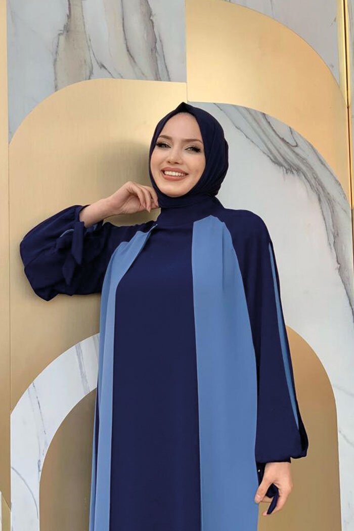 İki Renkli Parça Detay Balonkol Görünümlü Elbise 3799 İndigo