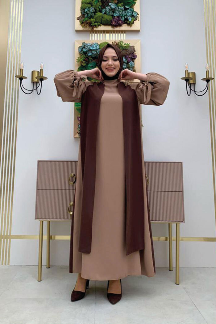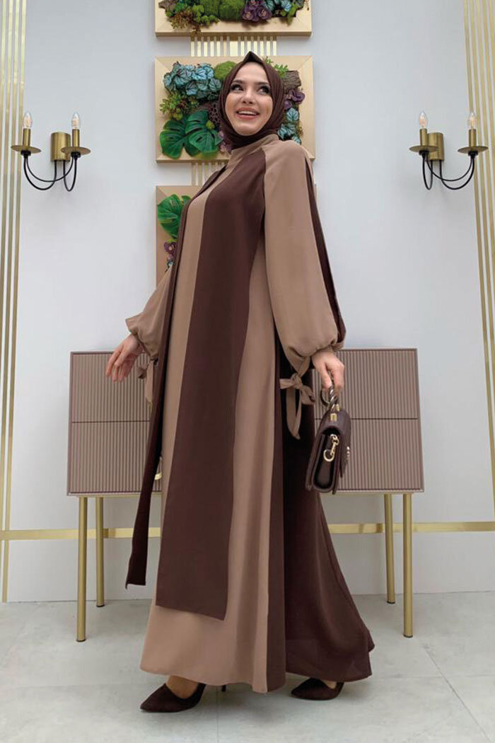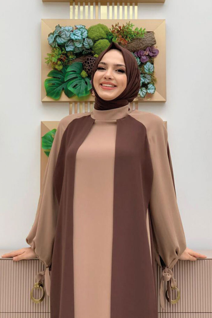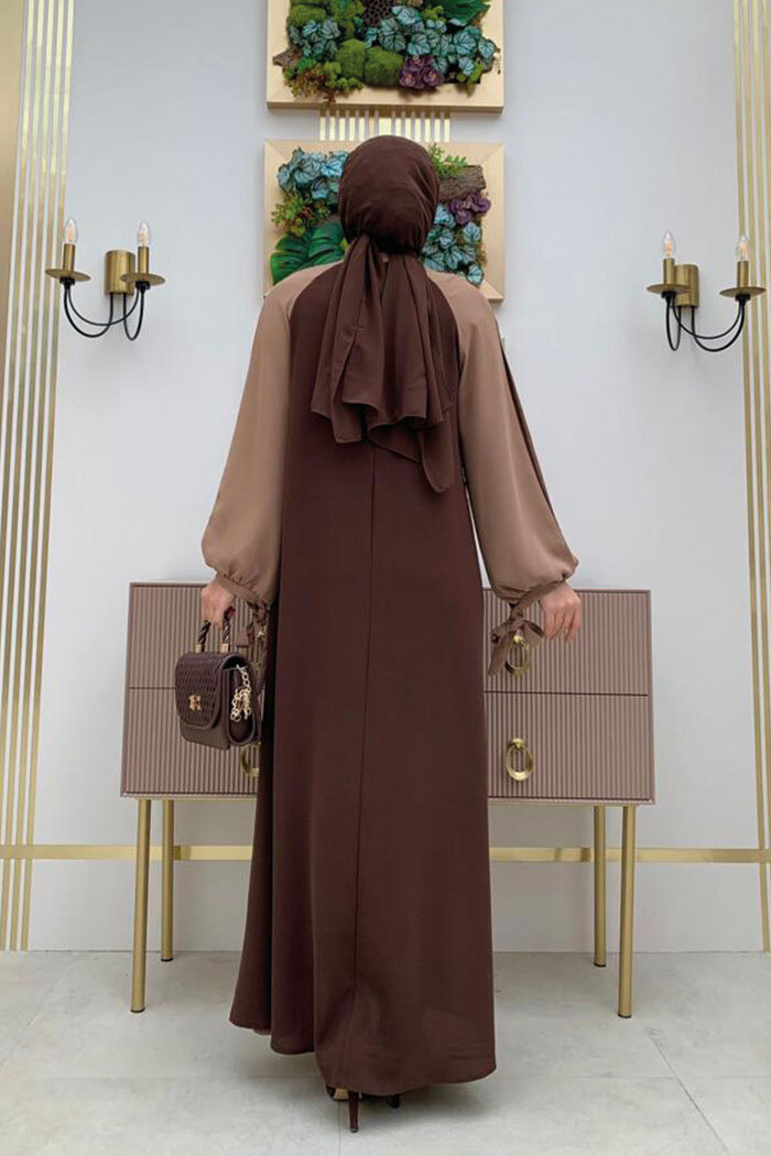 İki Renkli Parça Detay Balonkol Görünümlü Elbise 3799 Kahverengi