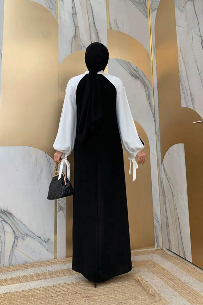 İki Renkli Parça Detay Balonkol Görünümlü Elbise 3799 Siyah