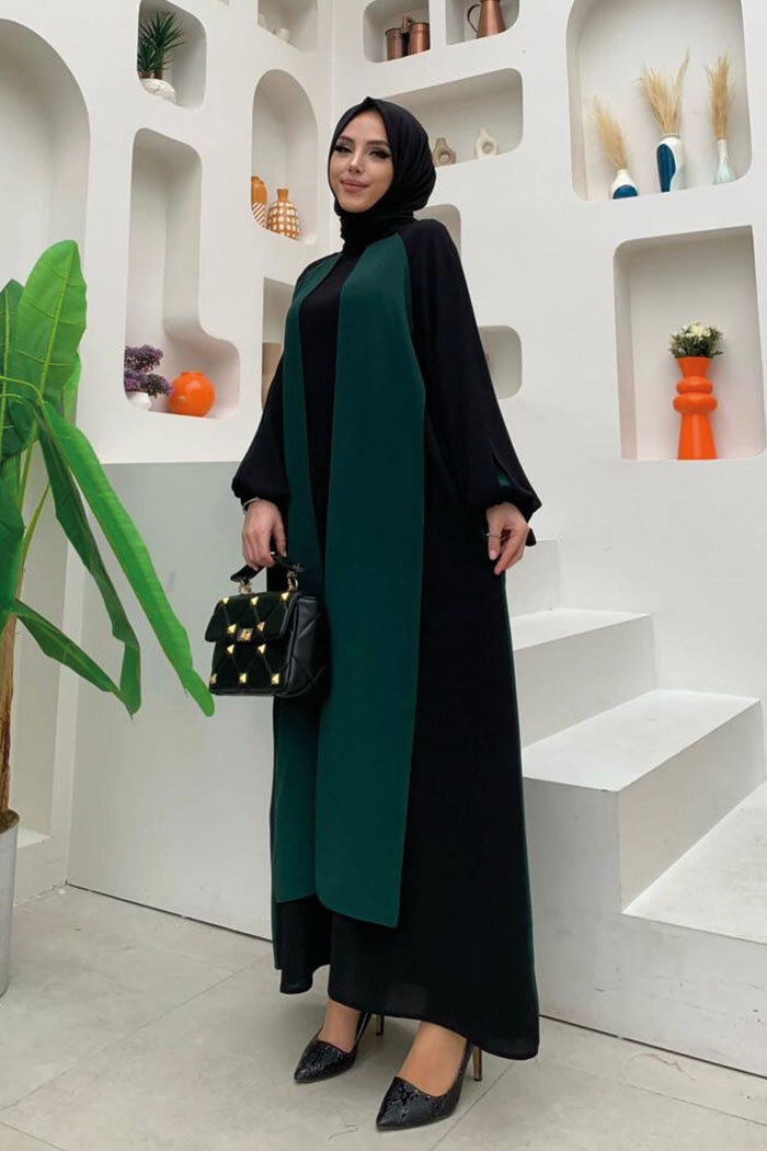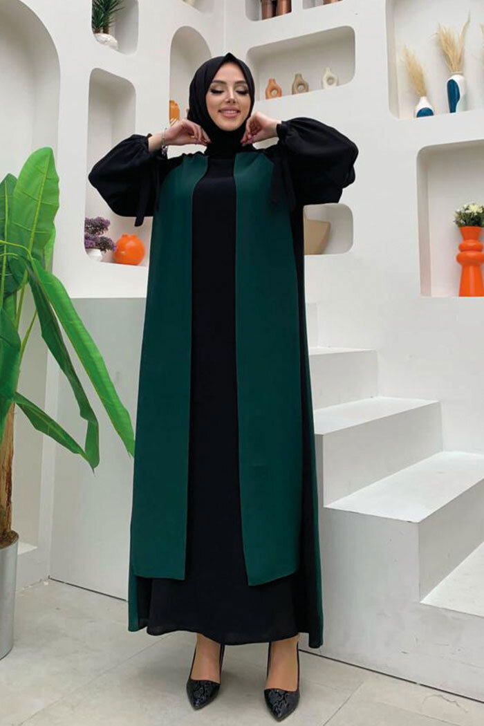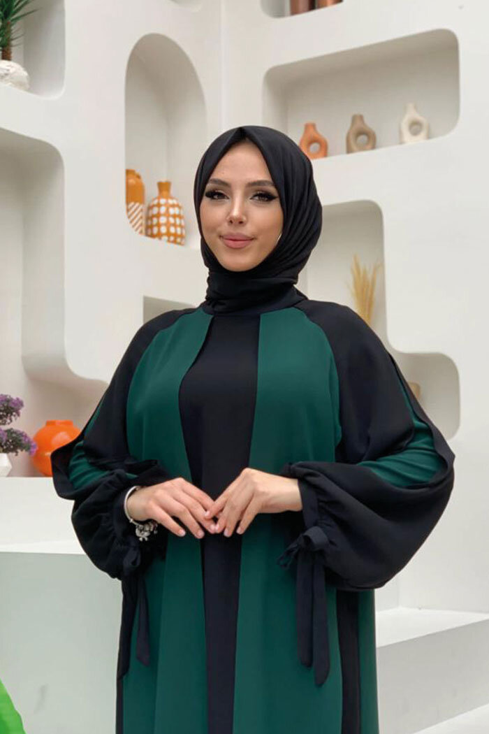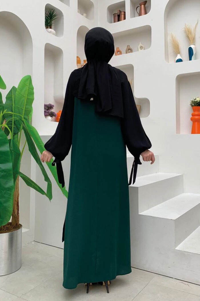 İki Renkli Parça Detay Balonkol Görünümlü Elbise 3799 Zümrüt