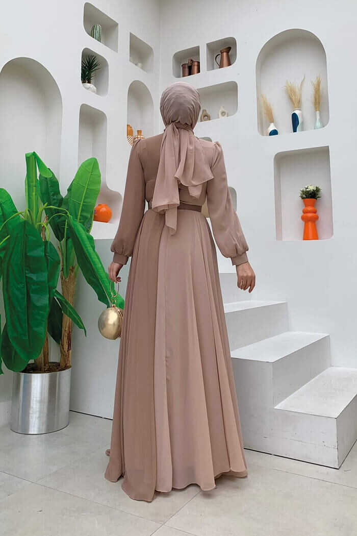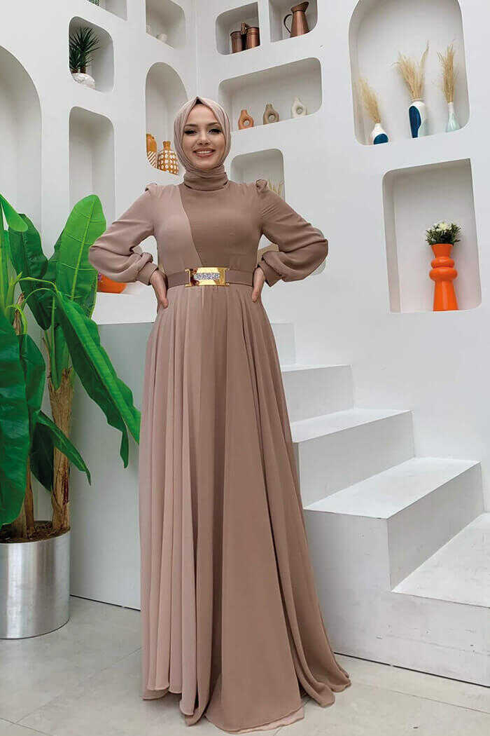 İki Renkli Şifon Bel Kemer Aksesuarlı Büyük Beden Abiye Elbise 3806-1 Vizon
