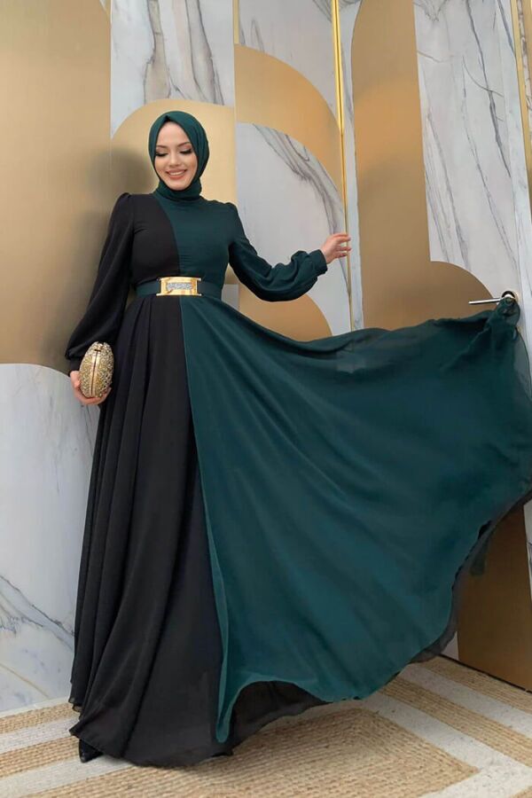 İki Renkli Şifon Bel Kemer Aksesuarlı Büyük Beden Abiye Elbise 3806-1 Zümrüt