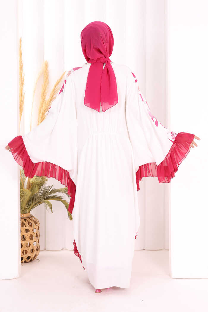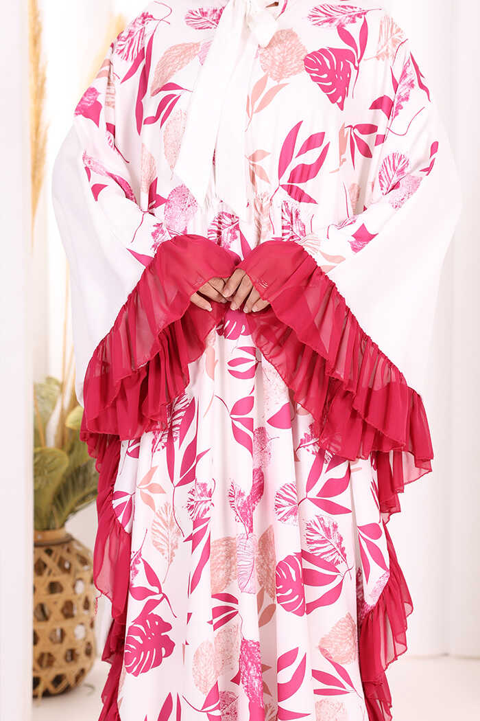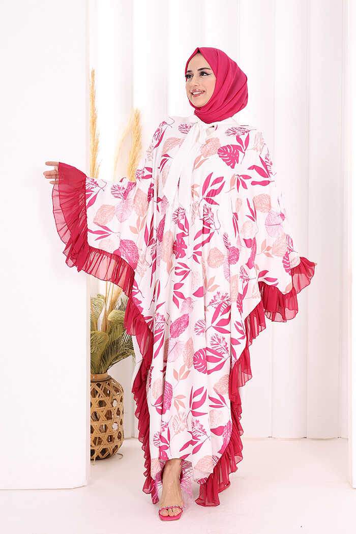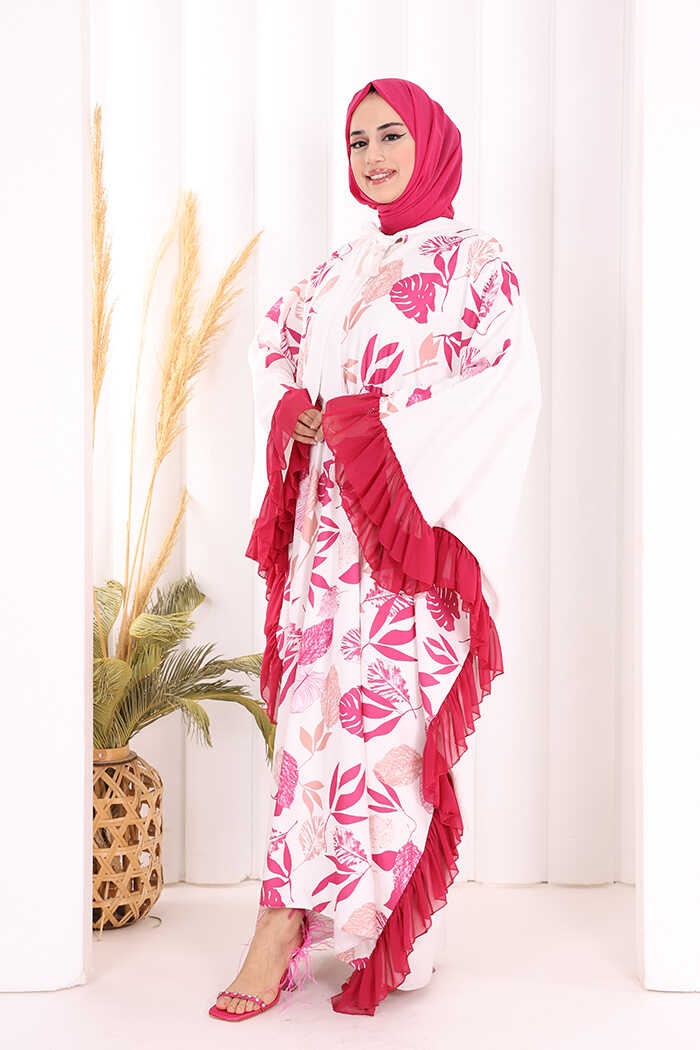 Yaprak Desenli Şifon Fırfır Detaylı Yarasakol Elbise 3816 Fuşya