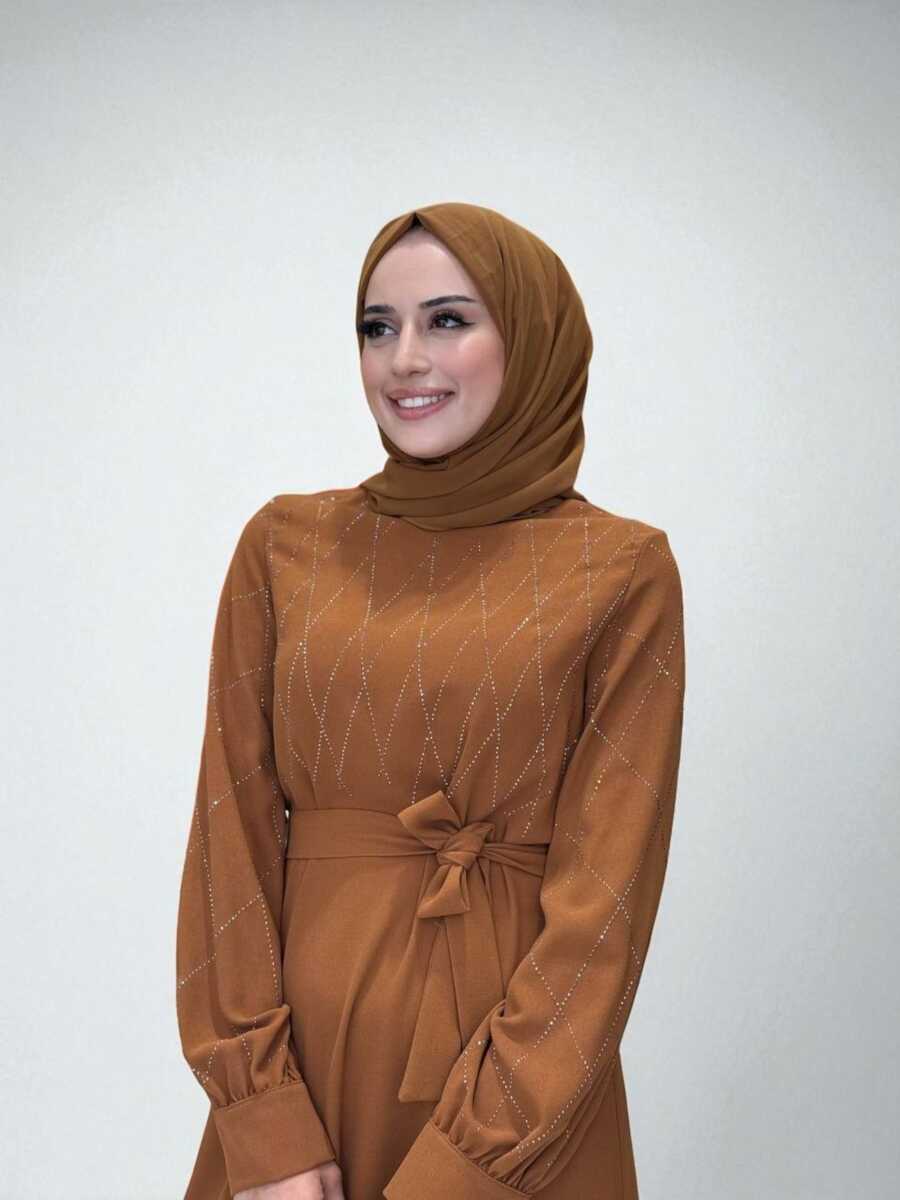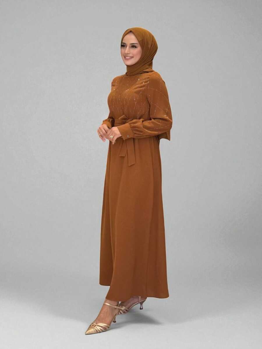 Taş İşlemeli Kuşaklı Elbise 3830 Taba