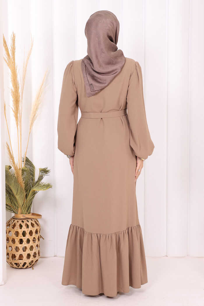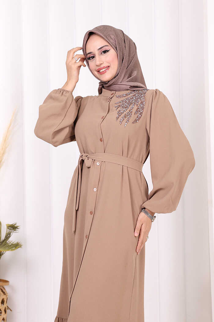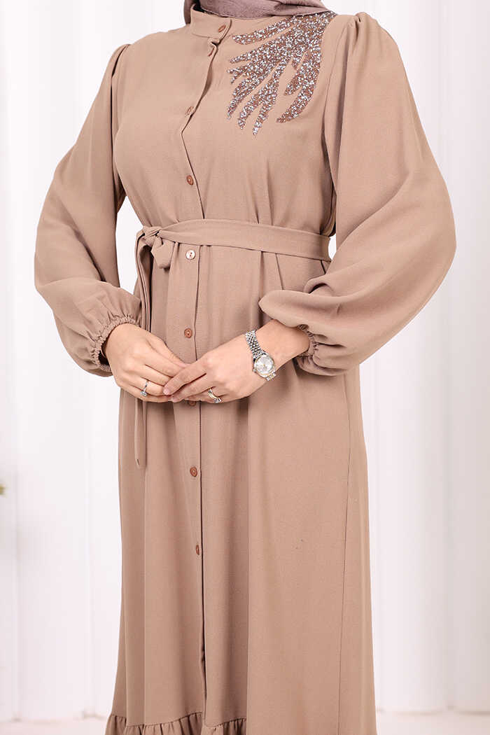 Boydan Düğmeli Omuz Taş İşleme Detaylı Ferace Elbise 3840 Vizon