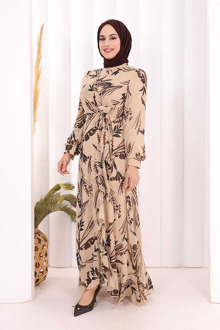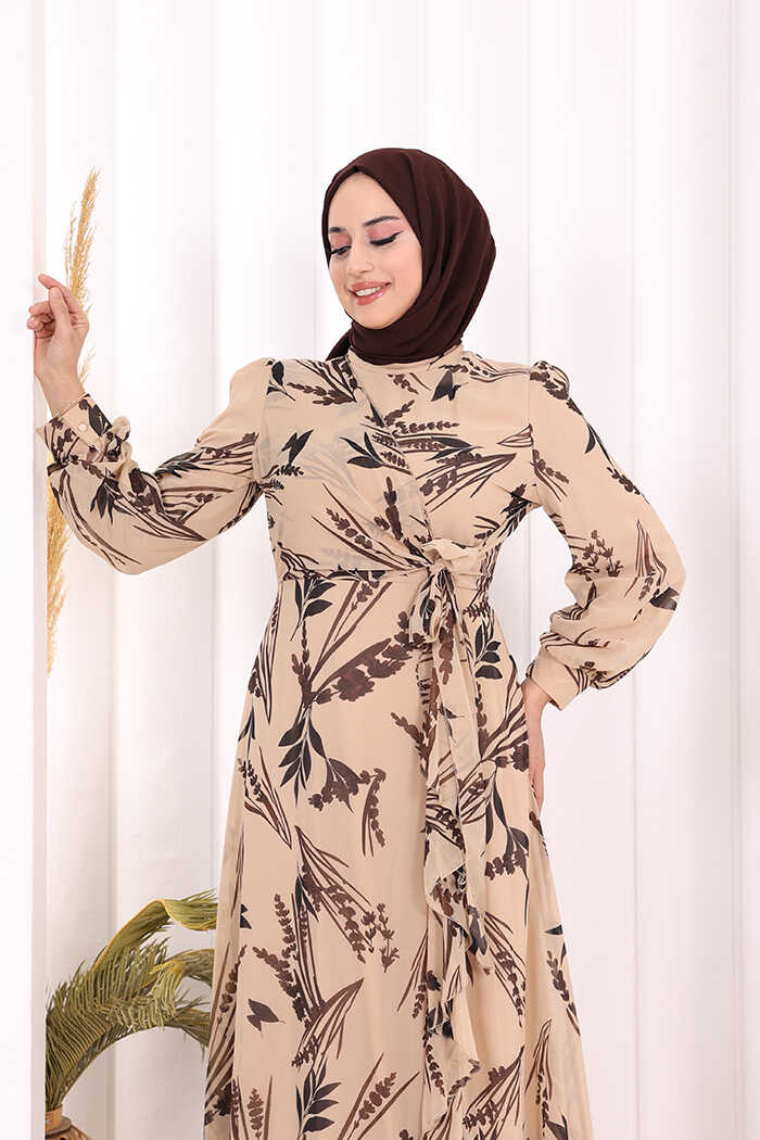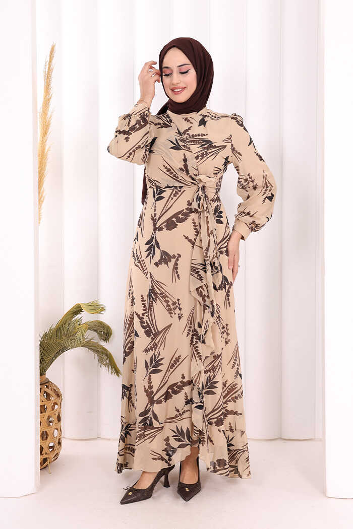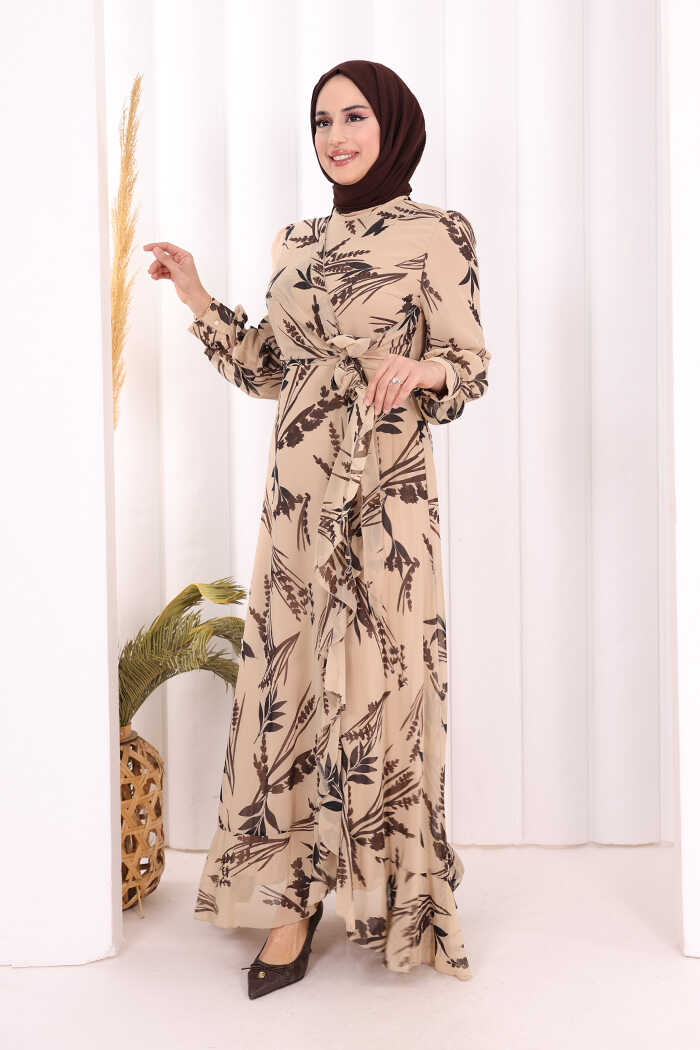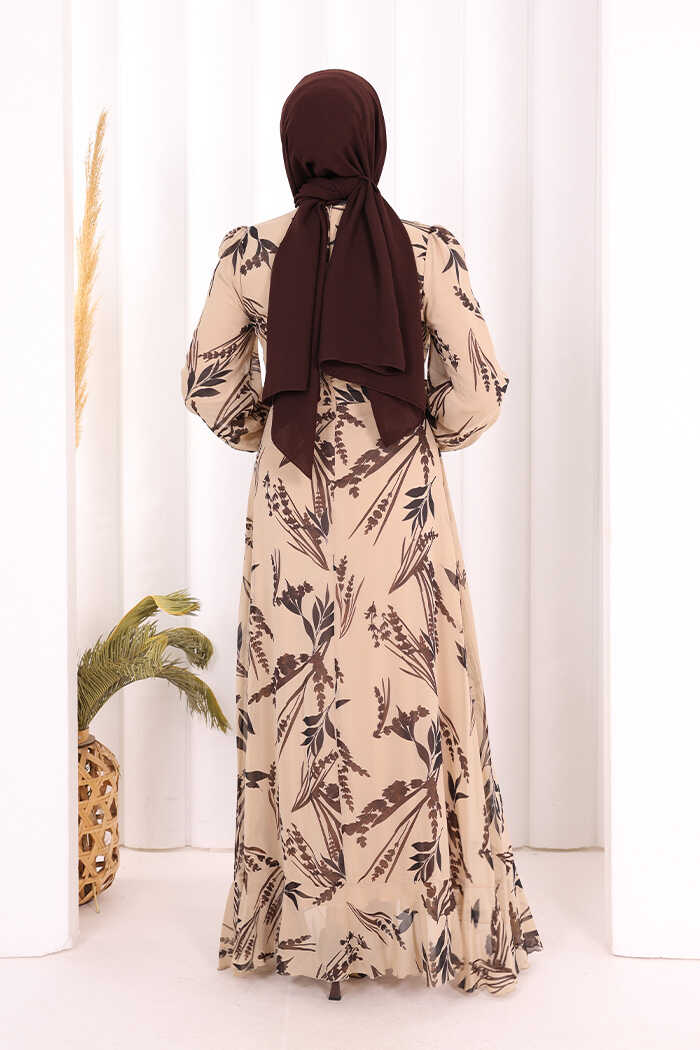 Yaprak Desen Fırfır Detay Şifon Elbise 3842 Taş